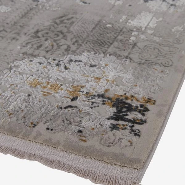 With its curling Islamic patterns and a worn effect, this low pile rug in charcoal and rusted yellow is designed to add texture and gentle colour to your room.