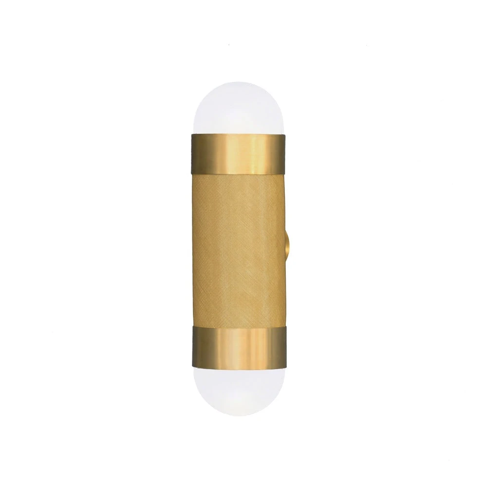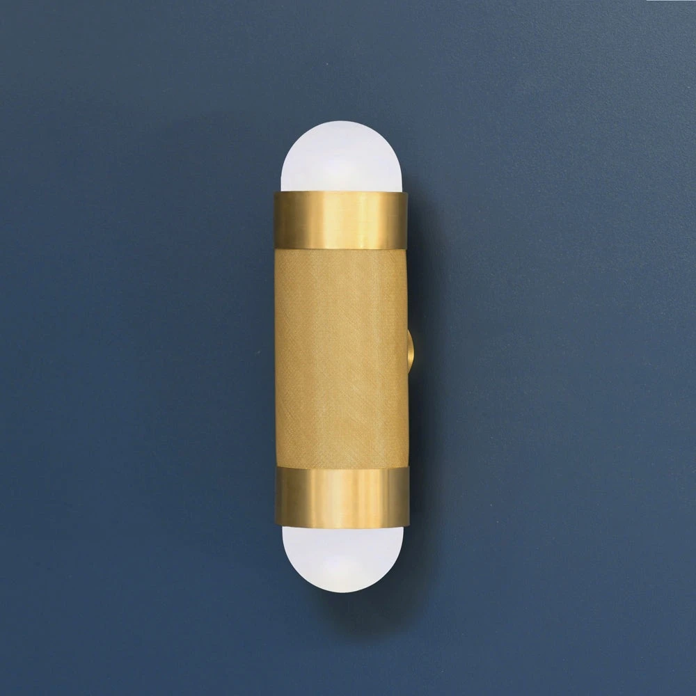 The LOOM wall light is defined by its signature woven brass cylinder, topped with hand-brushed brass sleeves and completed with soft-white opal glass domes. When illuminated the LOOM emanates a soft, warm glow through the brass weave, complimenting the main illumination from the from the glass domes.