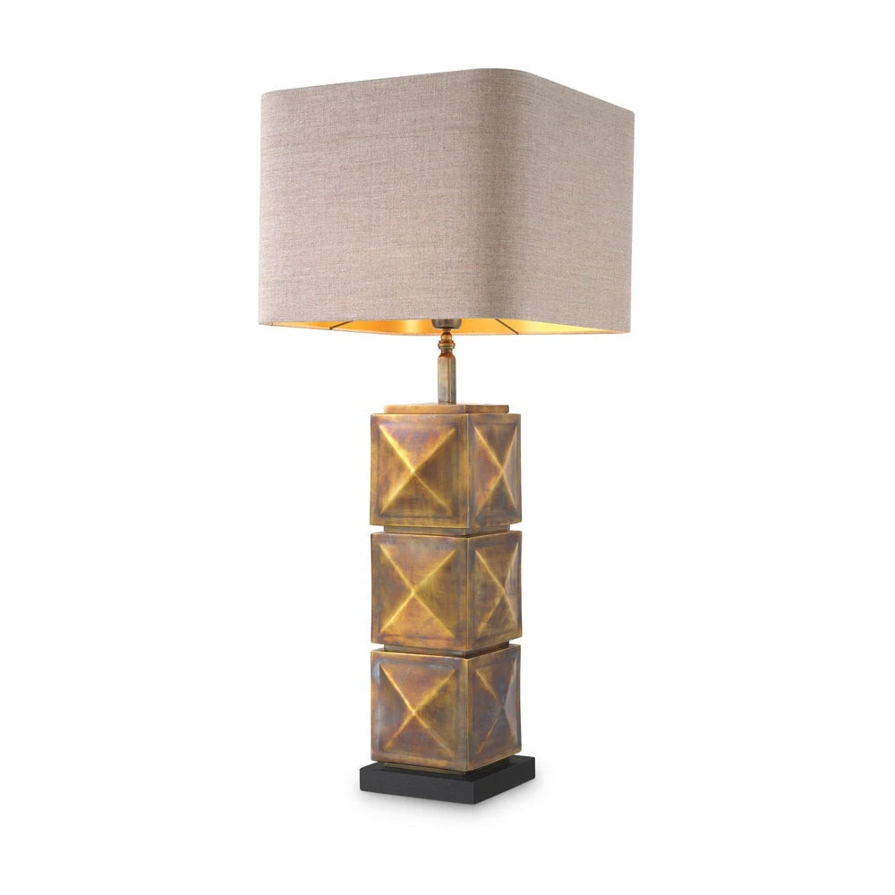 Channel a new dimension into your interior design scheme with the captivating Carlo Table Lamp. Exuding restrained opulence, this designer table lamp features a multi-faceted stainless steel base with a vintage brass finish and a square lampshade.