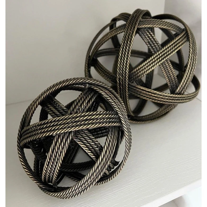 Create a stunning display on your any table, desk or shelf with the 2 piece set of Melville Desk Accessories. Resembling unrolled balls of string, these decorative open work objects are artsy sculptures. Crafted from stainless steel, they feature a vintage brass finish.