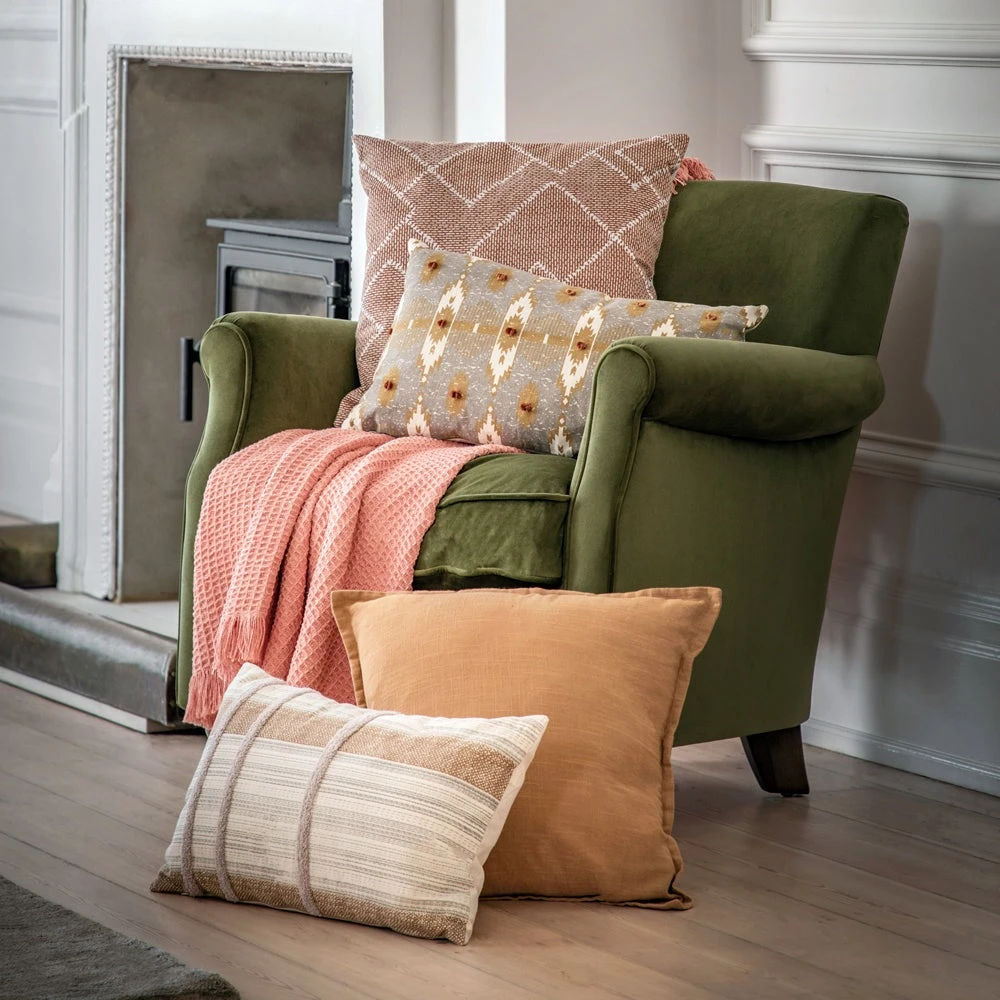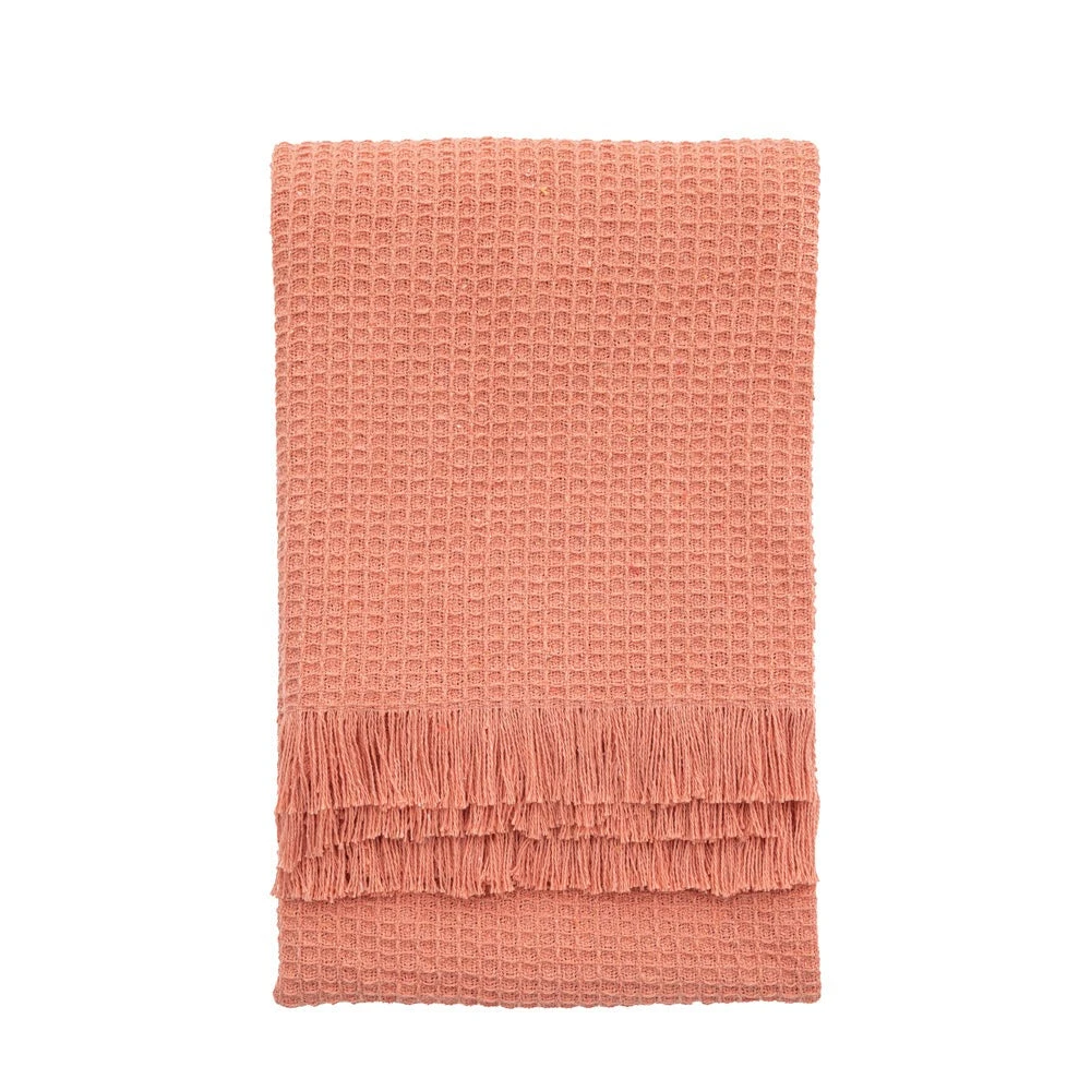 With a large waffle texture and soft fringe detailing, this soft throw will add a cosy feel to any room. The neutral blush tone is designed to suit a variety of interiors. Coordinating cushion cover available.