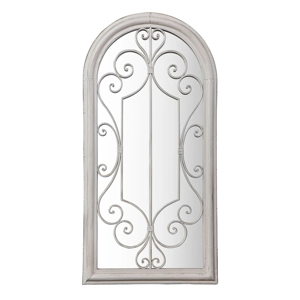 Add a touch of elegance and romance to any outdoor living space with our unique in style Roni mirror. Featuring intricate metal work detailing with a soft arched top in a painted white finish. Please note this product is designed for outdoor use and will age naturally due to the additional elements found in an exterior environment, resulting in a natural patina.
