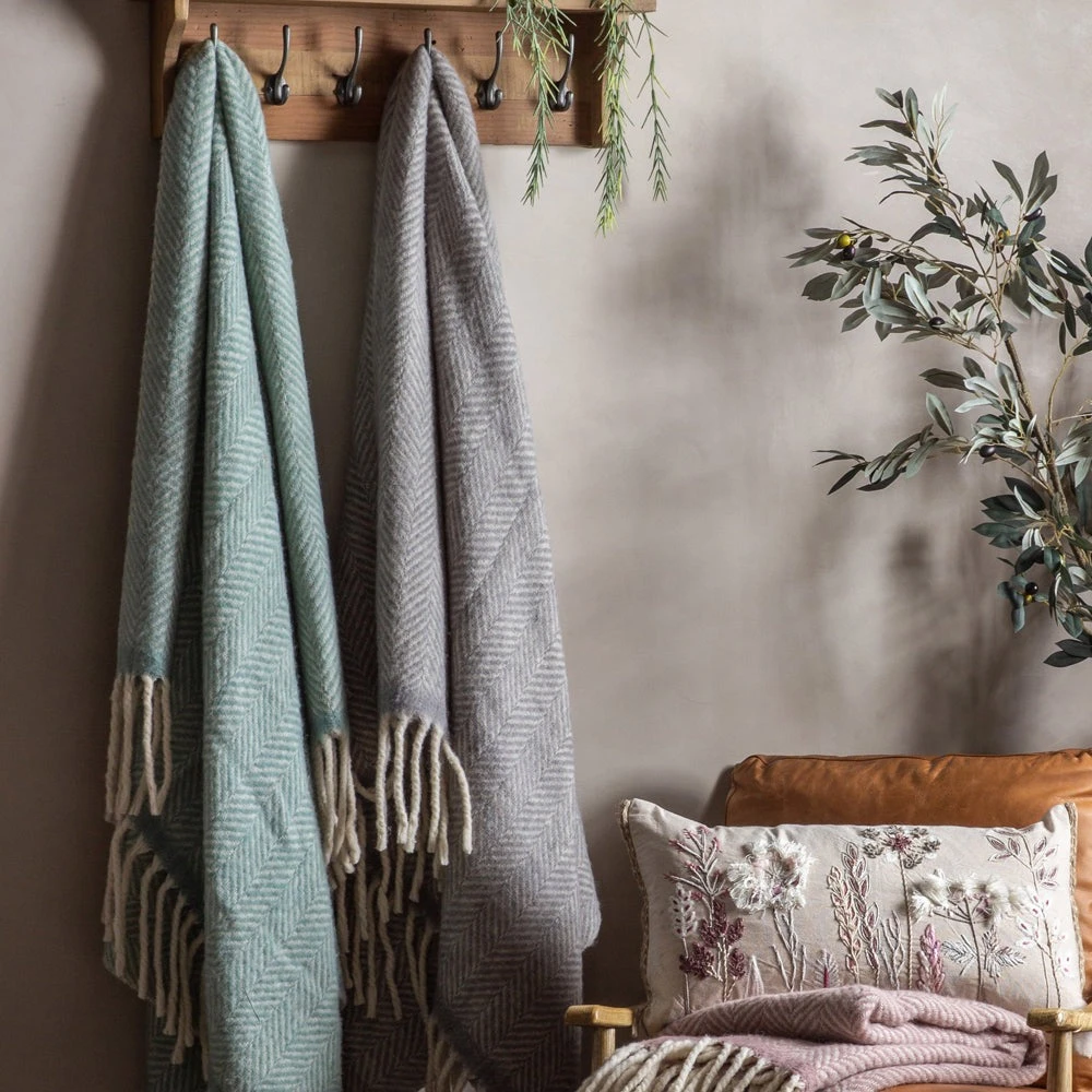 Beautifully soft 100% wool throw in a herringbone design, roll packaged with cream ribbon.