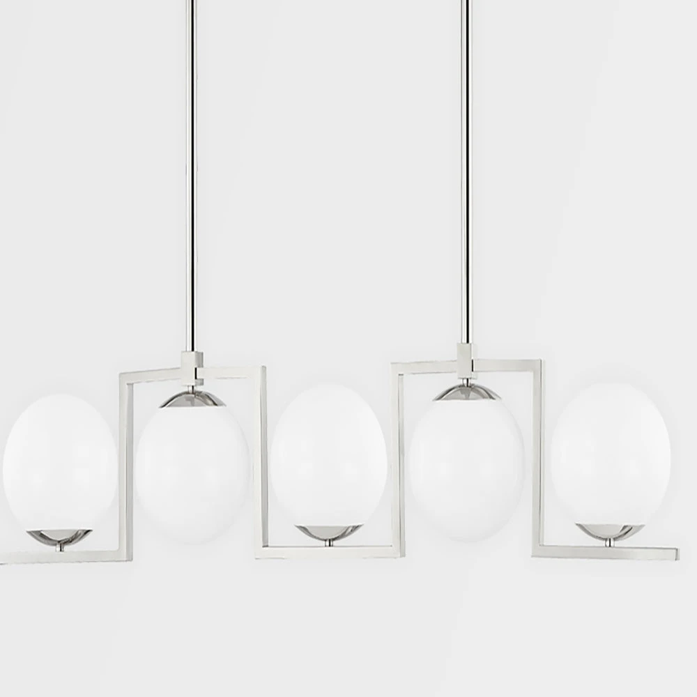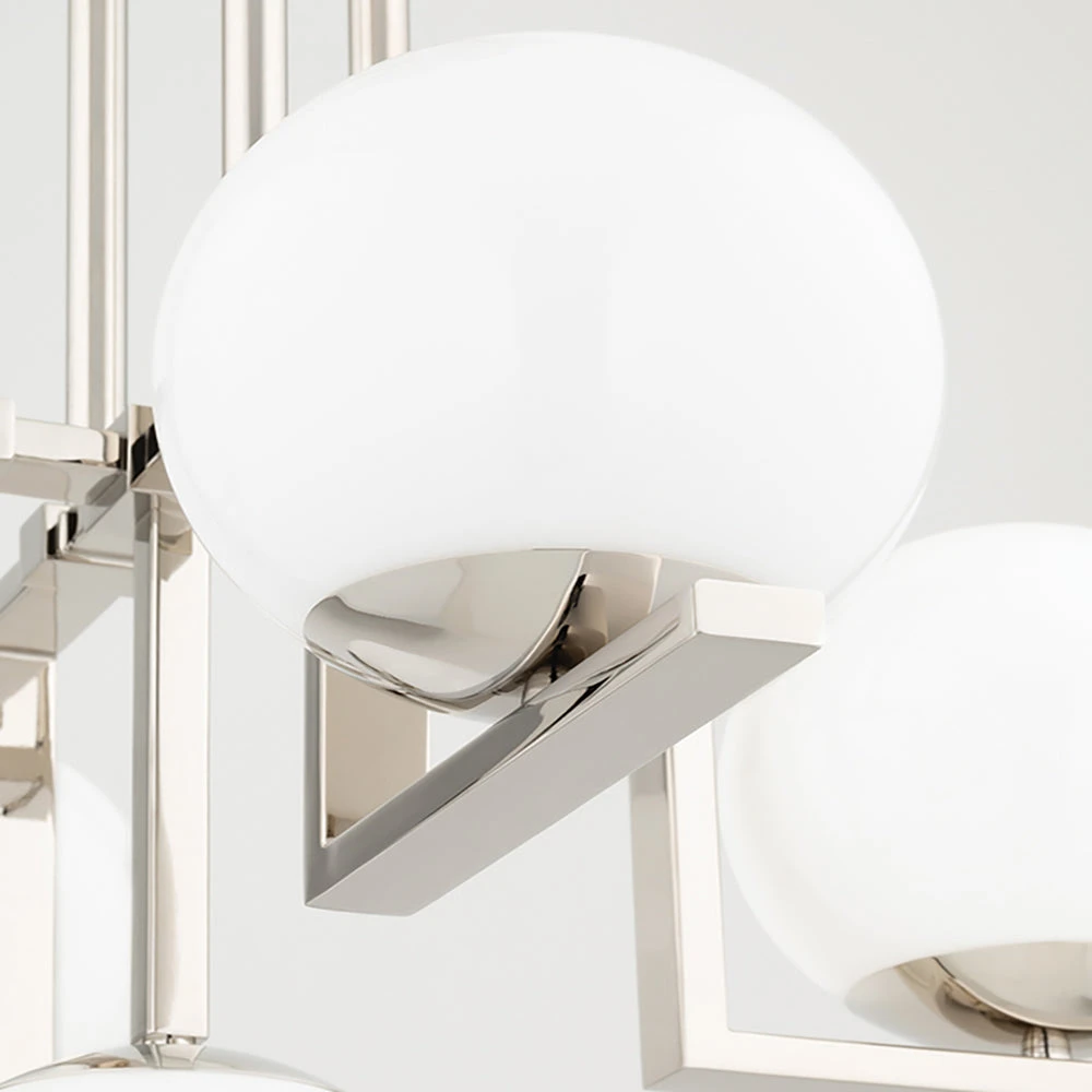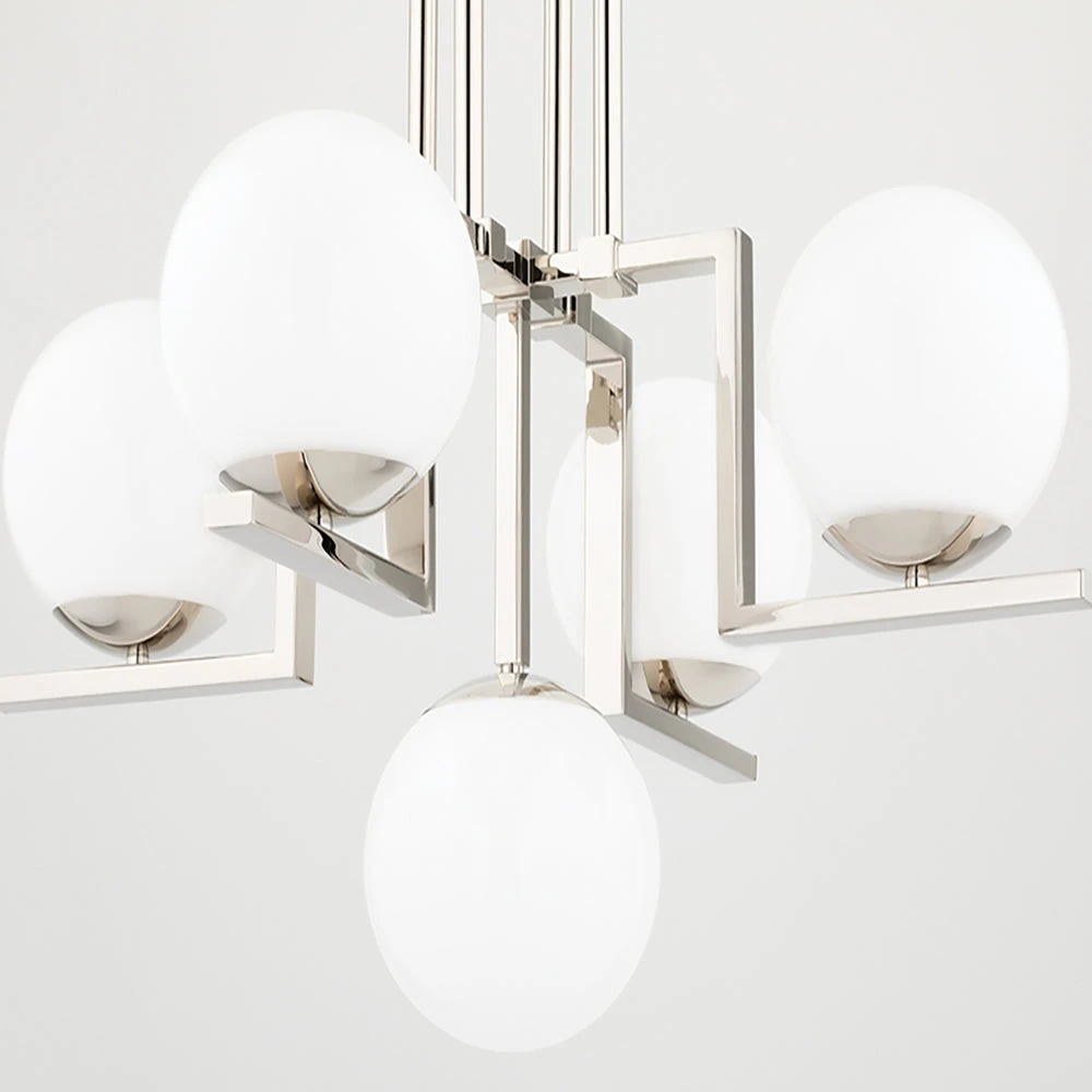 This Tanner semi flush pendant light from Hudson Valley Lighting has a unique and stylish design that is entirely contemporary. It features four large, soft opal coloured glass globes which are attached to angled metal arms, finished in a glimmering aged brass. The light fitting attaches directly to the ceiling and radiates a softened light in all directions.