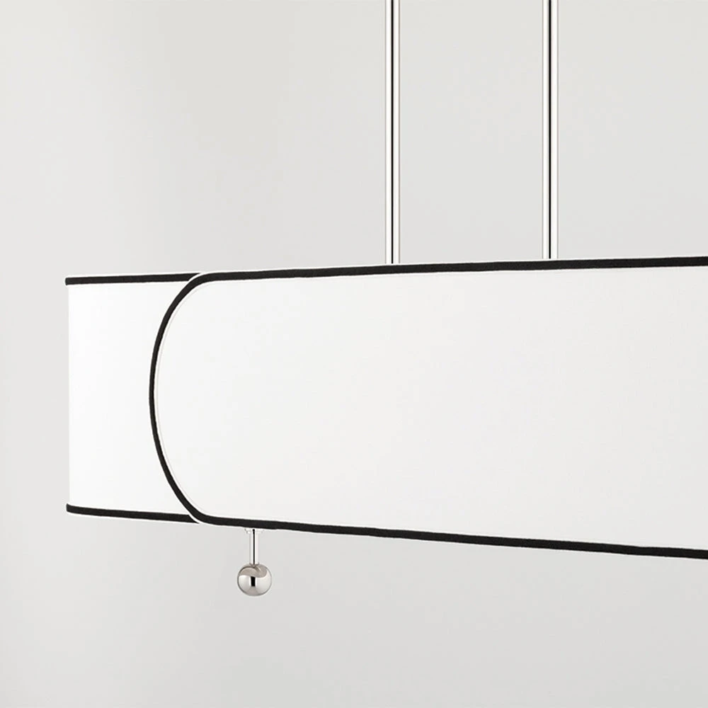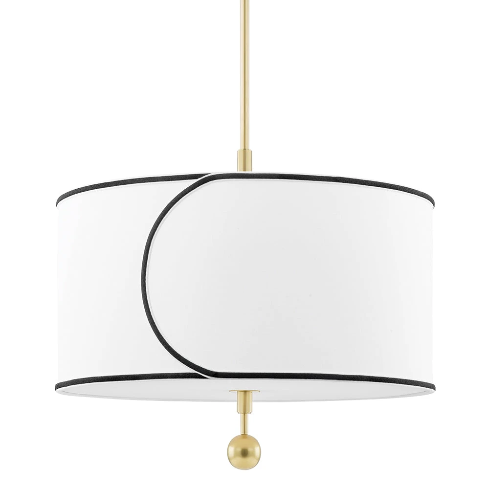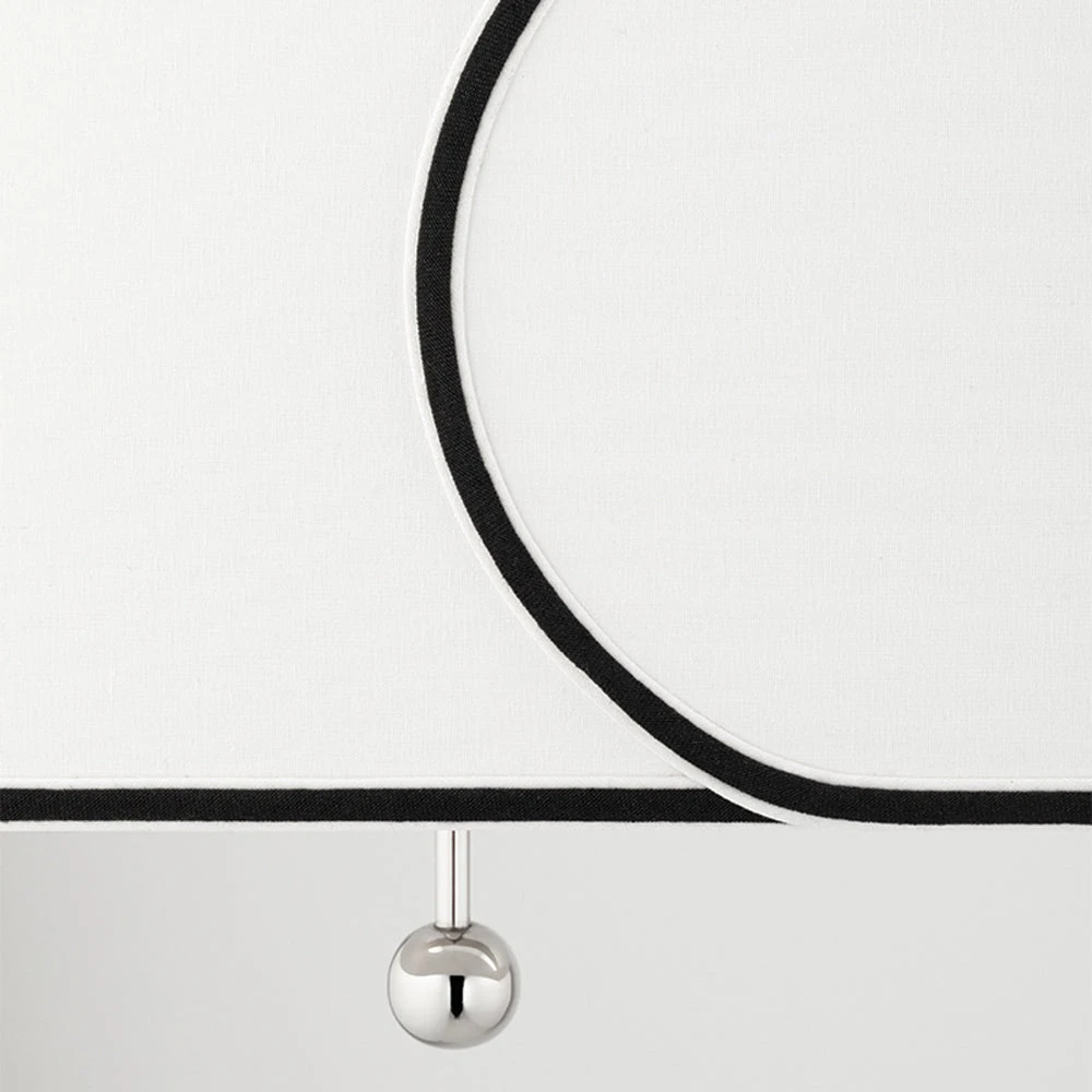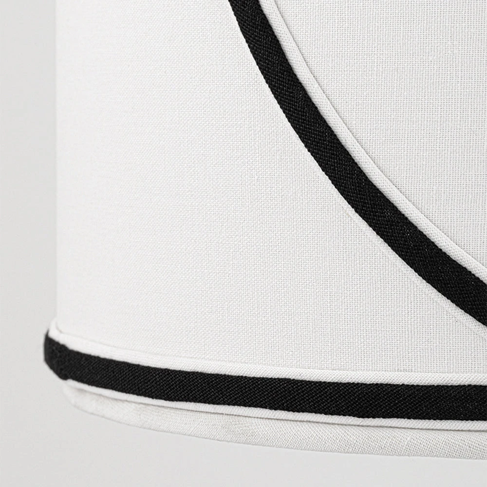 The gorgeous brilliant white drum lampshade is edged in black which creates an interesting dynamic and contrast to the piece. It has an overlapping design that adds to the effect.