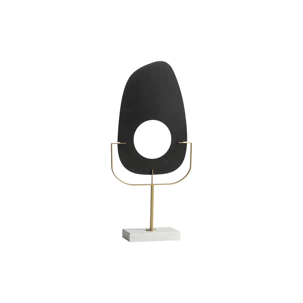 Beautifully contrasting white, black and gold tones combine in this Alma sculpture from Liang & Eimil to create a memorable and striking ornament. A dark abstract-shaped panel with a cut-out circular window draws your eye, complemented by the gold-toned metal hardware it rests atop. The sculpture is finished with a marble base, which provides both texture and smoothness.
