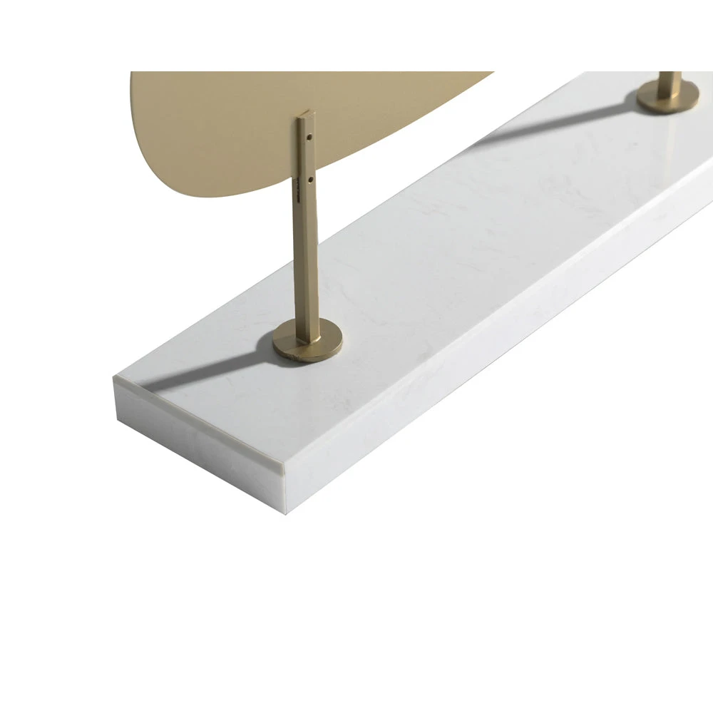 An almost flat gold coloured disc in an interesting shape set on a marble base, this piece will catch the eye and also the light without losing the sense of style and grace it provides effortlessly. The cut-out section also allows you to play around with perspective using other items to work together with this beautiful piece. Measuring H:30 x W:43.5 x D:10 cm.