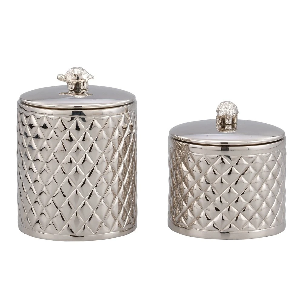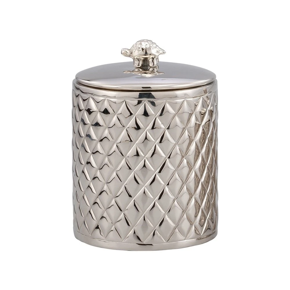 Elevate your dresser with the Liang & Eimil Box in Nickel. This highly polished piece glimmers on the bedside or side table. Its diamond-shaped exterior has a smooth border and the lid is decked out with a captivating turtle-shaped lift handle. Boasting superior quality with an attention-grabbing design, this box is contemporary elegance with a classic touch of Art Nouveau. Its small size exudes style and beauty.
