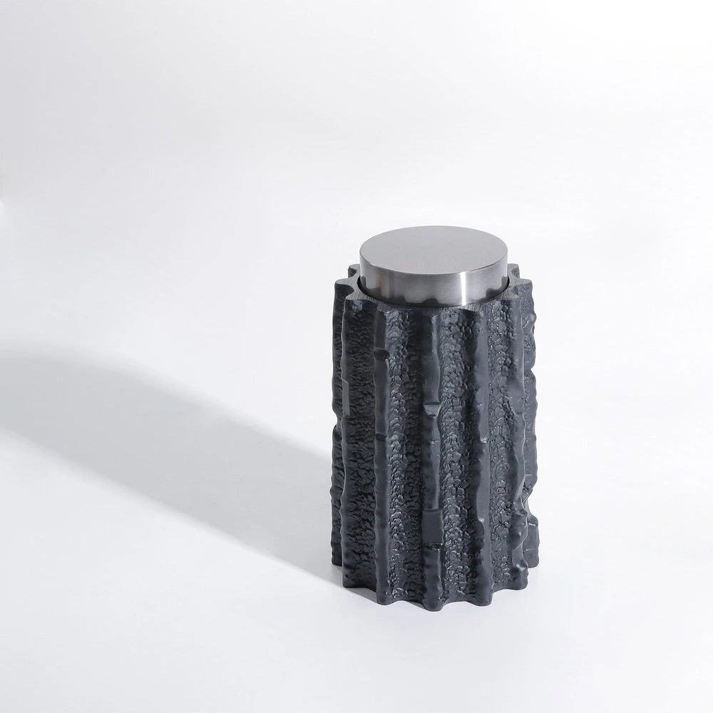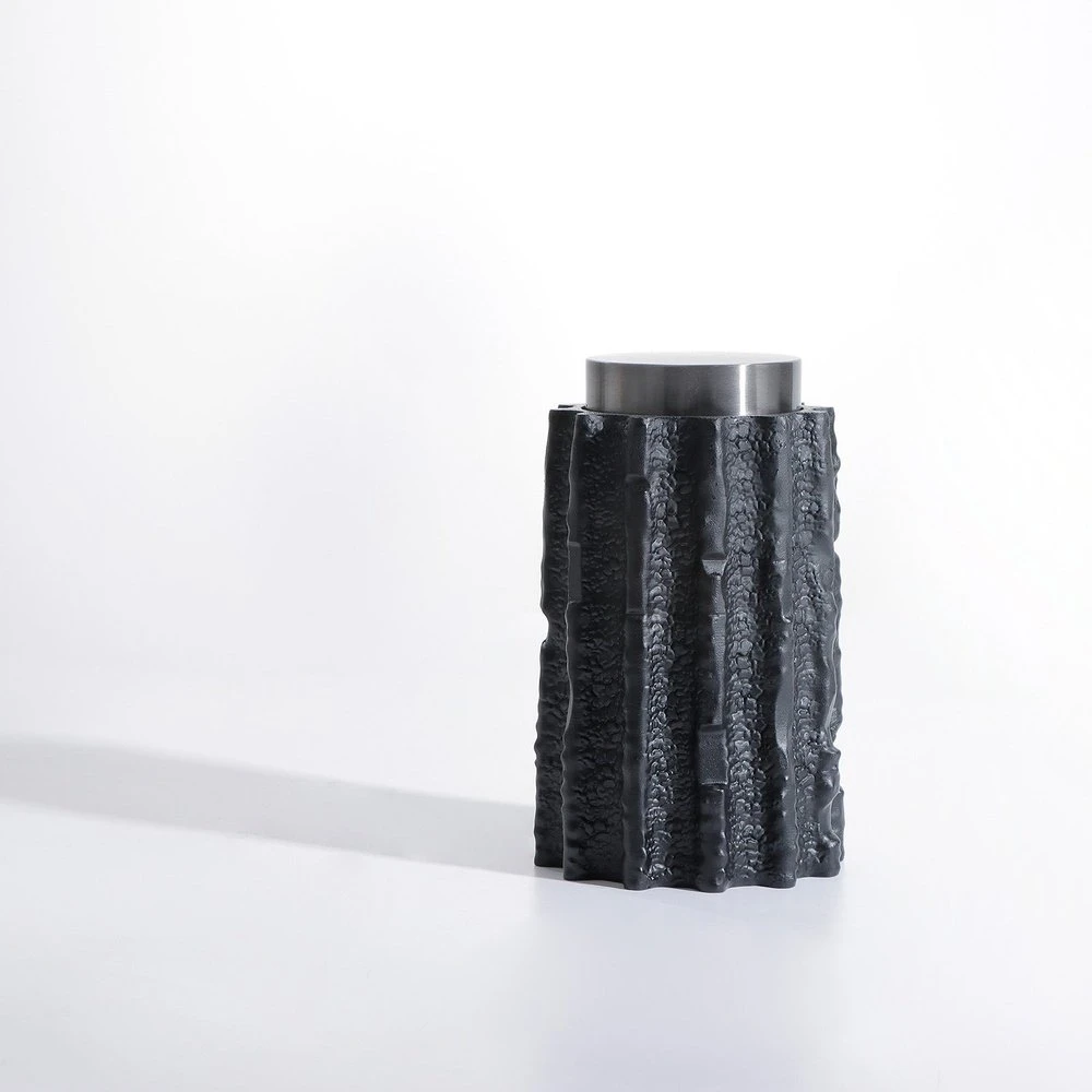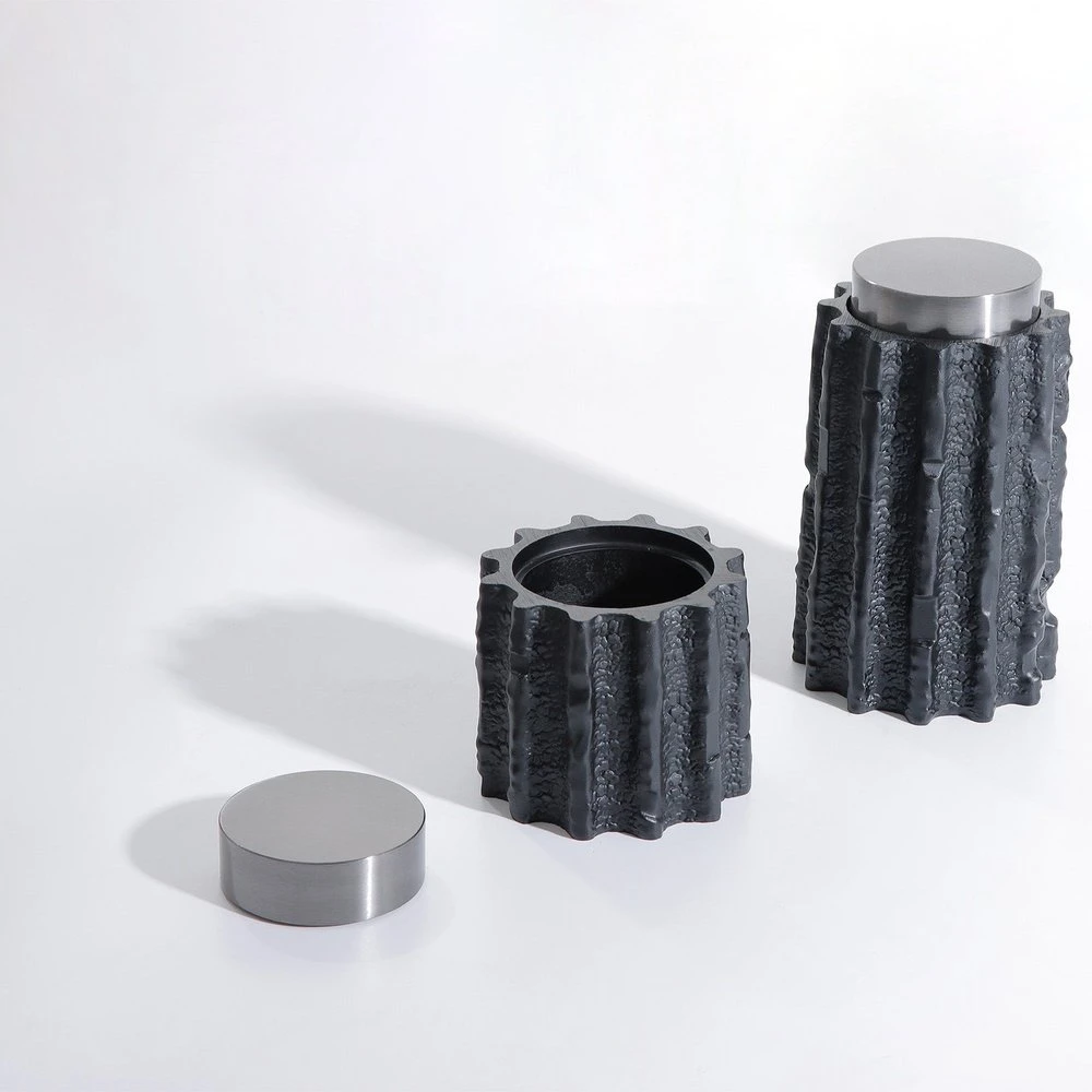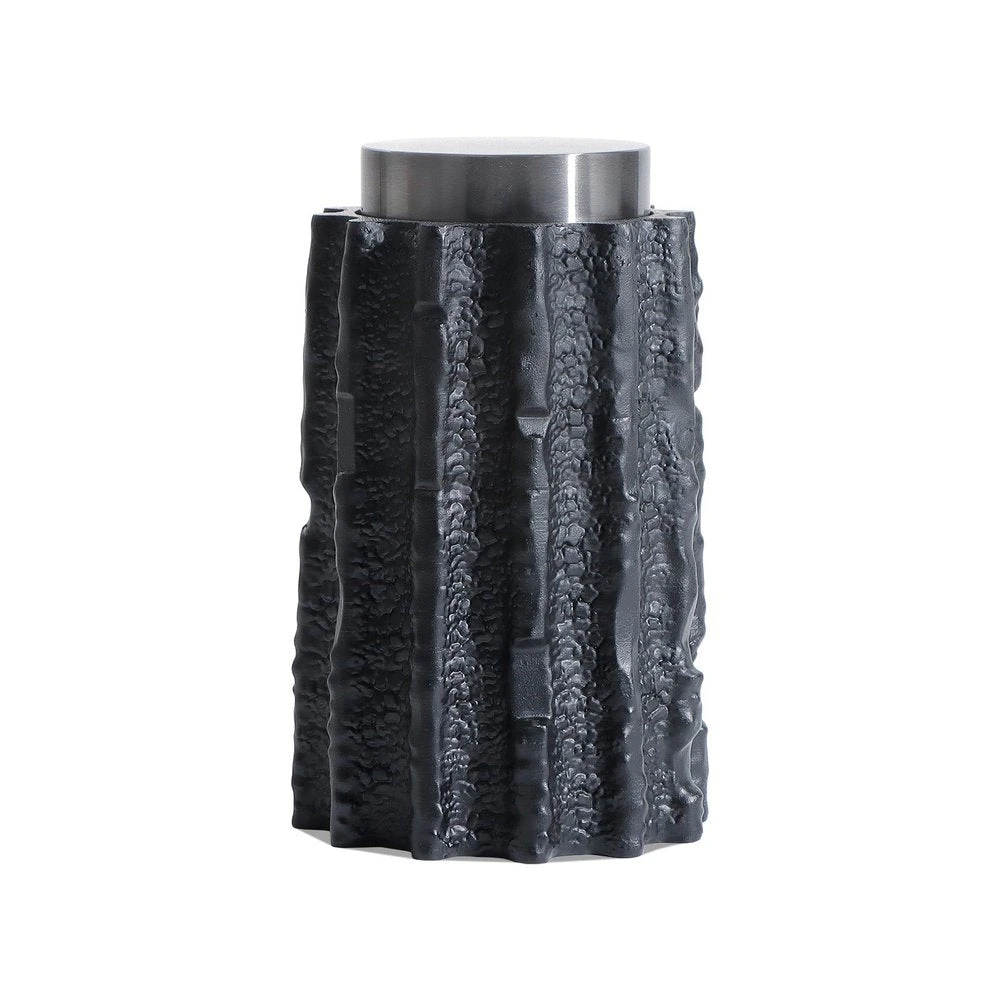 Meteorite Jar celebrates the beauty of the natural living world. Designed with black resin and stainless steel, the textural jar creates a rich visual contrast that invites the hand to reach out and touch. Place it next to its smaller size for a balanced look. Features: Black Resin & Stainless Steel Jar