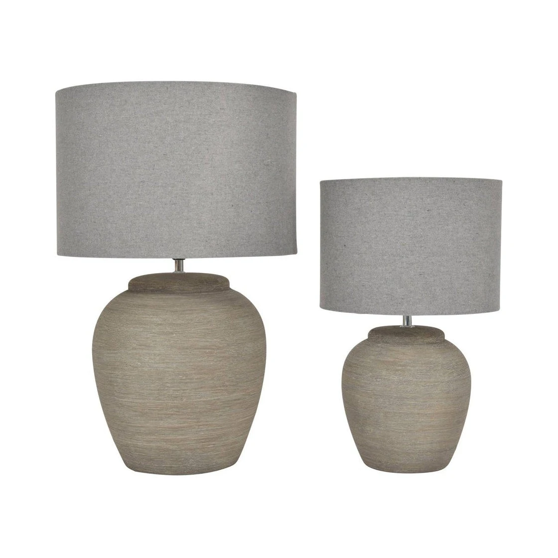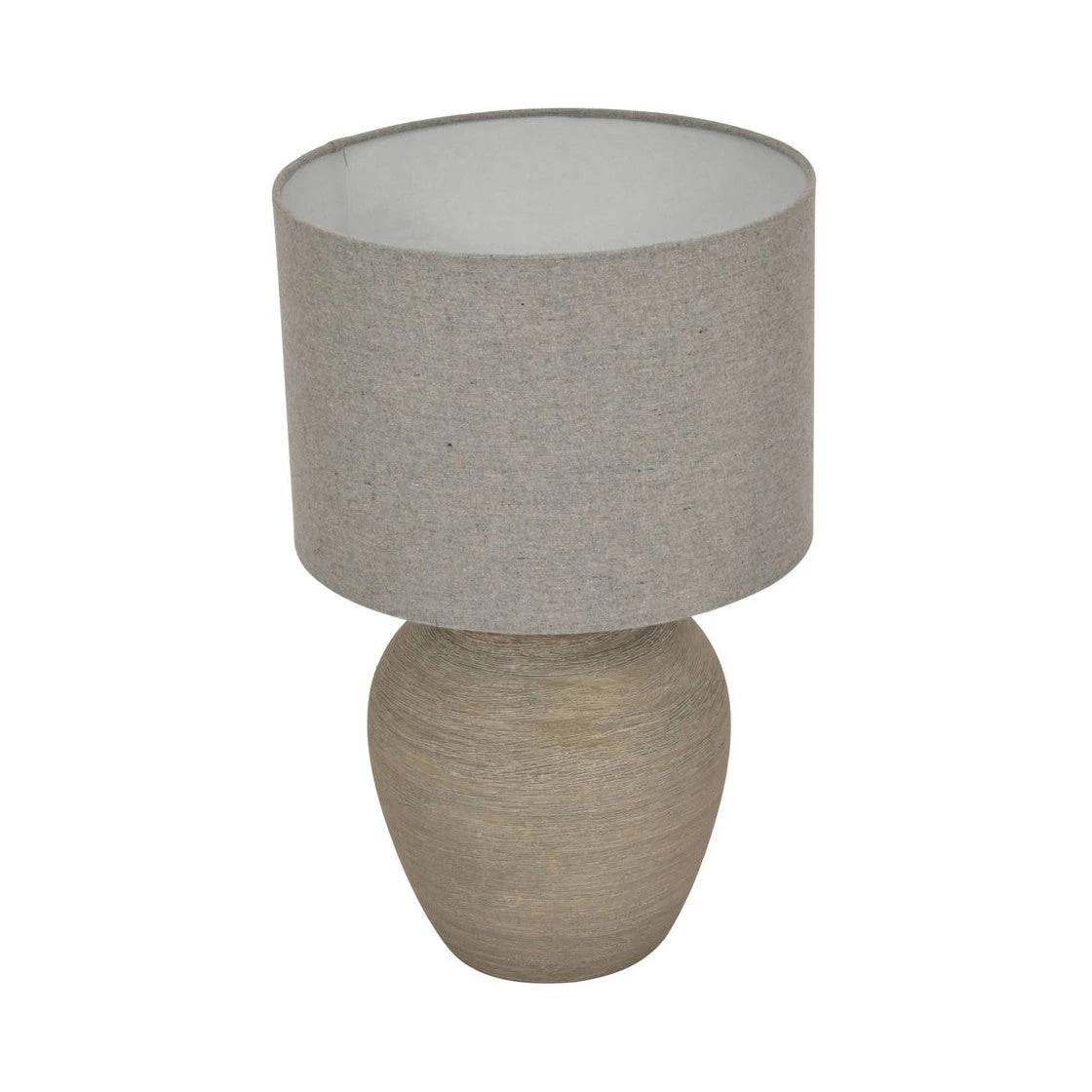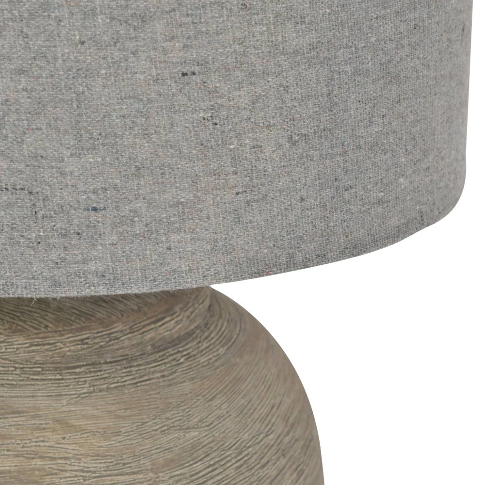 The Libra Baslow Etched Grey Large Ceramic Lamp is a beautiful, neutral desk lamp. The base is classically shaped in textured grey ceramic, which resembles wood and delivers a calm and serene effect. The round grey linen shade is attached via an upright silver mount and completes the piece.