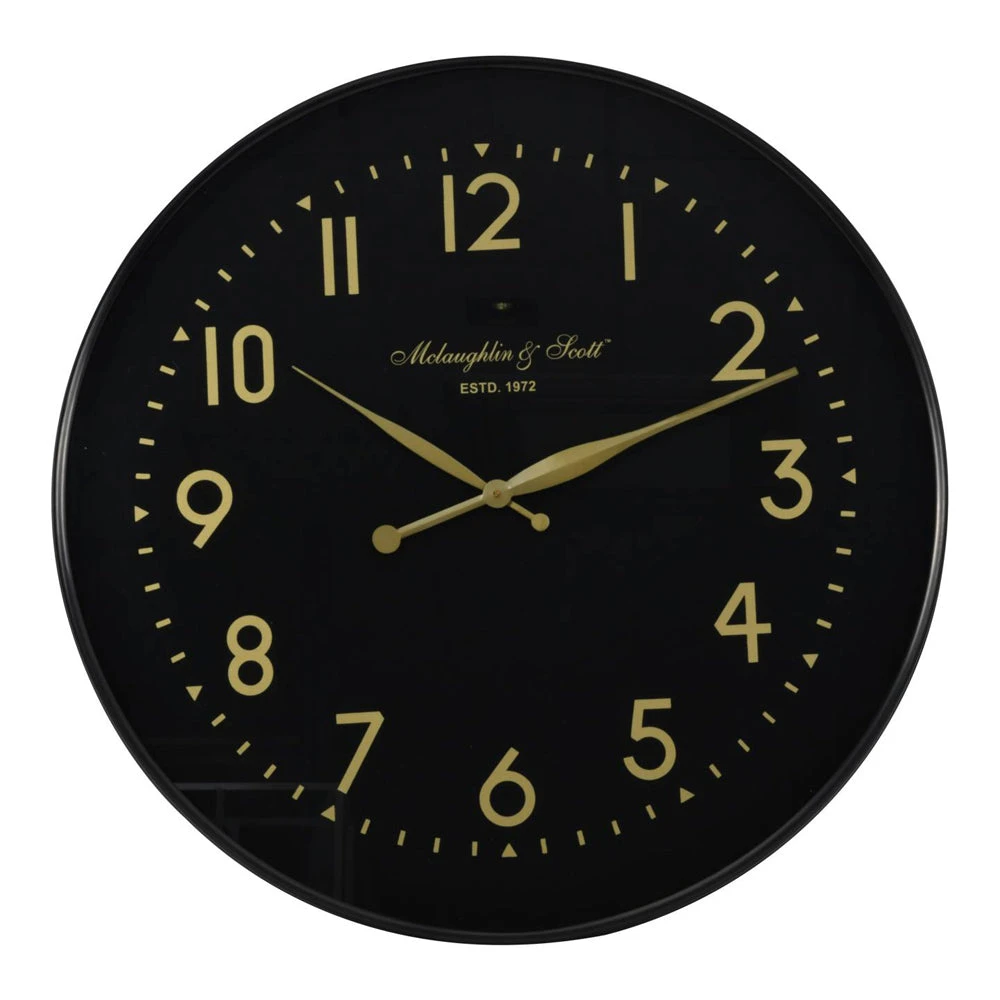The round clock face, which is made from steel, has a matte black finish and a glass panel at the front. Screen-printed gold numbers, as well as gold minute and hour hands, evoke a feeling of old-style Hollywood glamour. The black base and gold highlights provide a beautiful and timeless contrast.