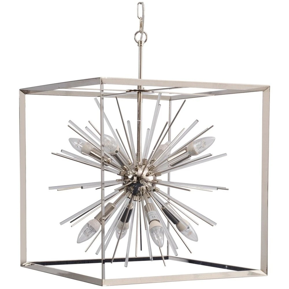 This striking hollow cube lamp houses a show-stopping starburst lamp fixture. Made up of acrylic and nickel rods, the stardust radiates outwards from a central metal orb. This is mood lighting with a difference, referencing traditional lighting with its boxy exterior and mid-century cosmonaut design in the exploding centrepiece within.