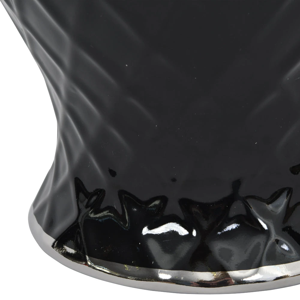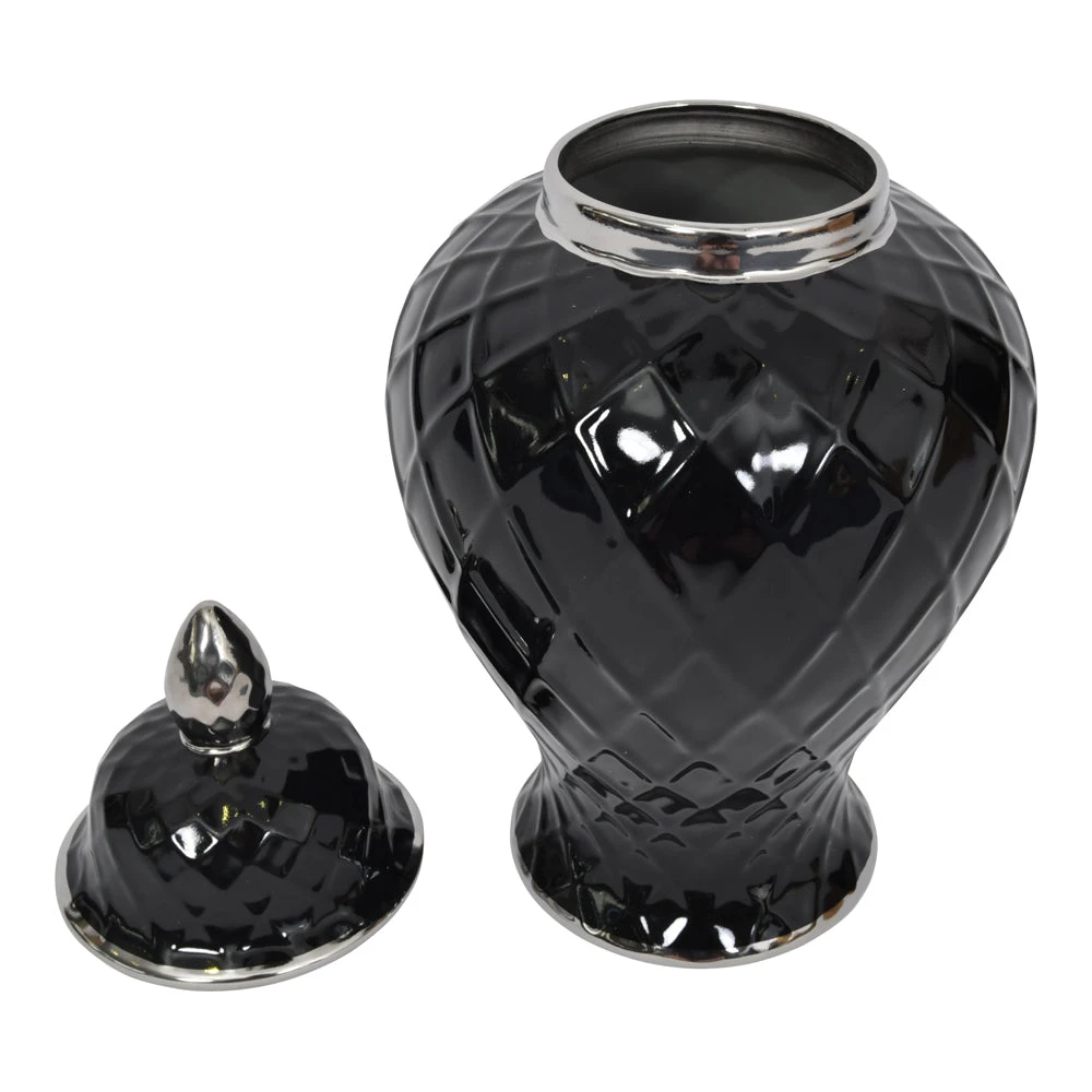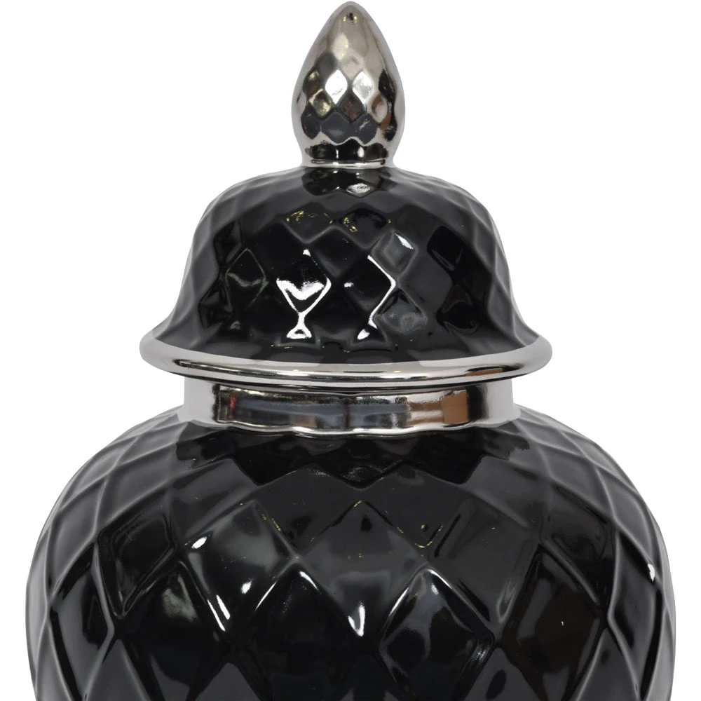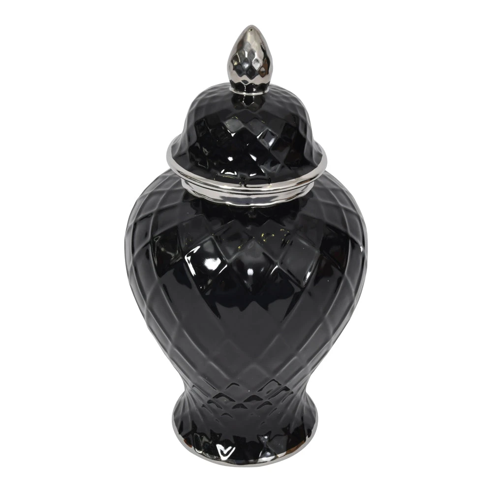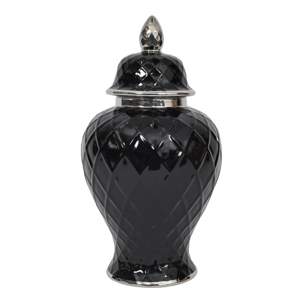 Bring some style, glamour and sophistication to your home with this stunning Mayfair ginger jar from Libra. This ceramic jar made in black with a silver trim exudes elegance and charm as its glossy black finish catches the light. With a diamond pattern and a beautifully shaped lid, the colour, shape and finish of this jar make it a perfect addition to any home.