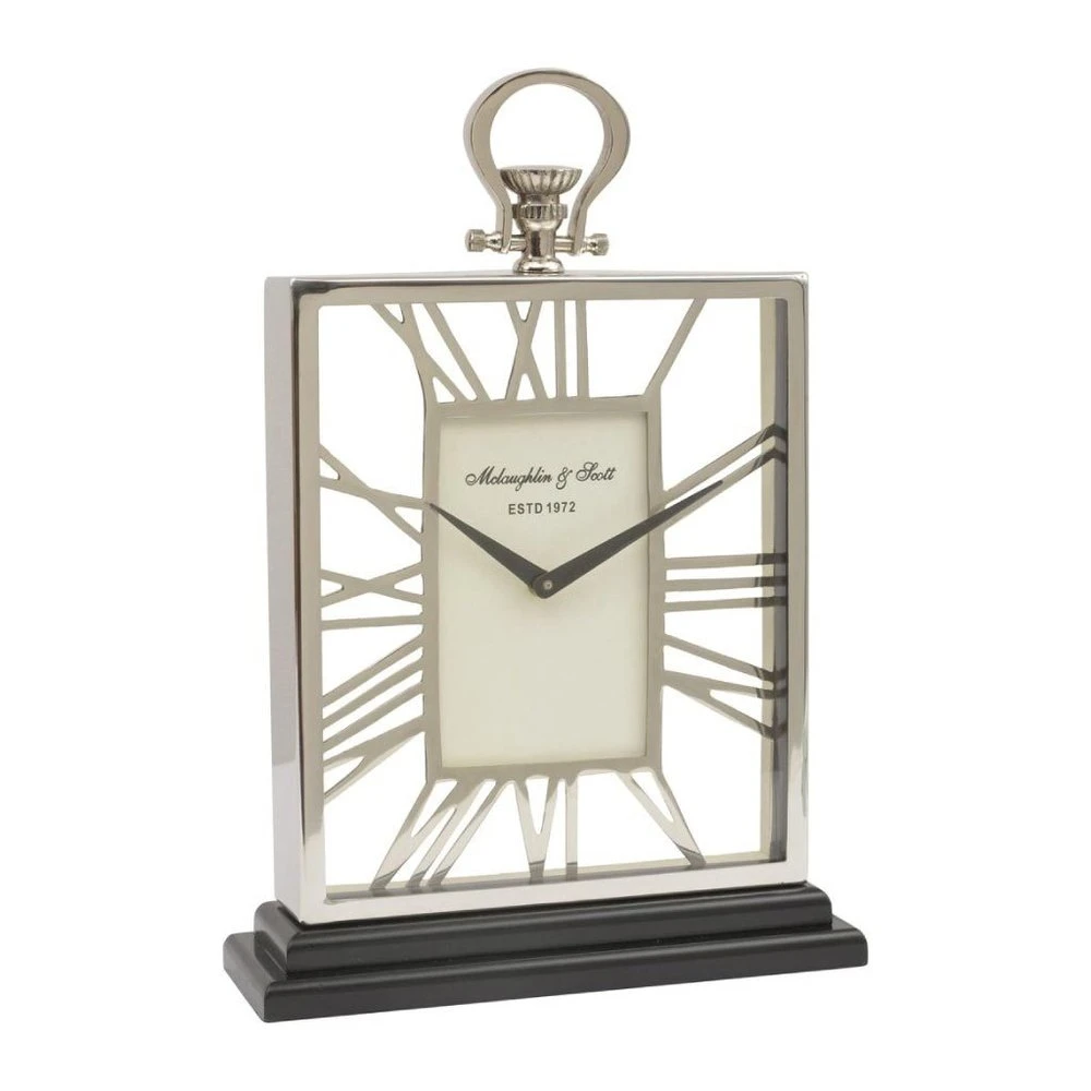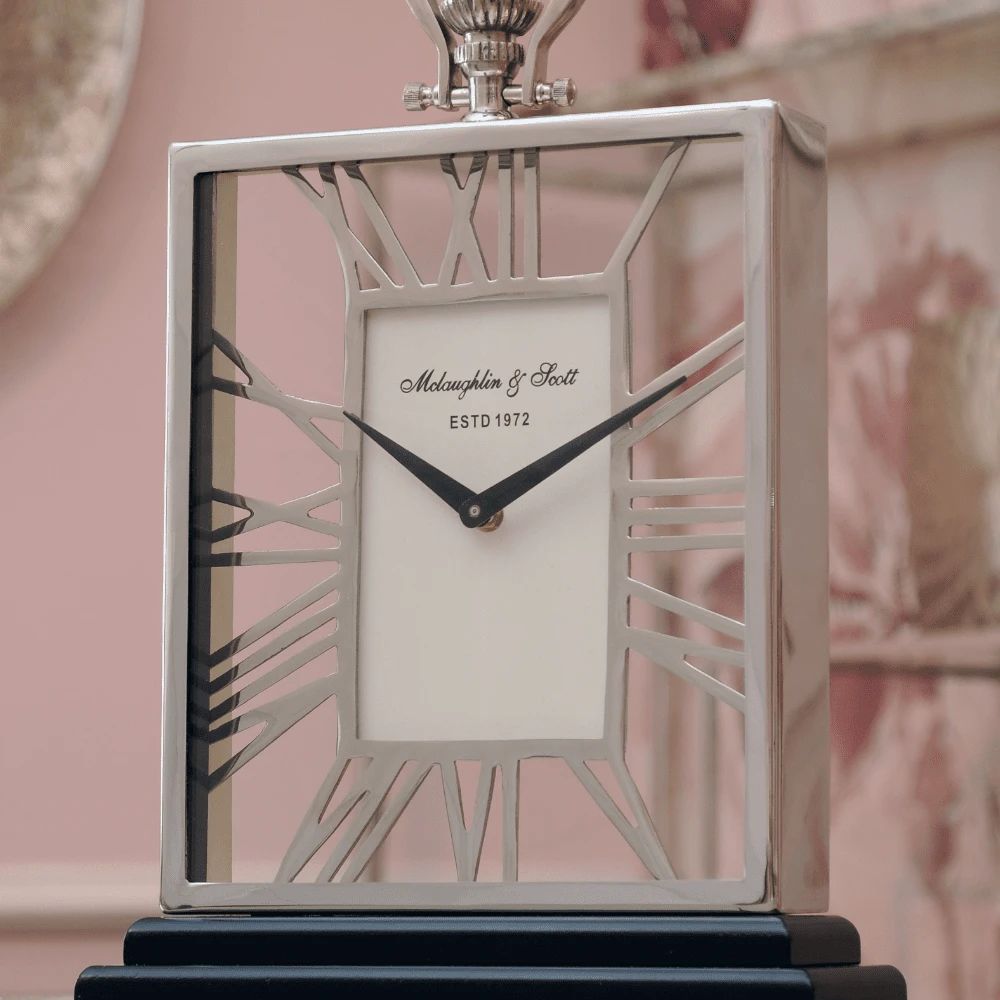 From the polished steel base to the intricate nickel case, every inch of the clock has been painstakingly crafted to the highest standards. The concept cleverly incorporates roman numerals into a contemporary design, giving a modern twist to a very traditional theme. The crystal clear glass protects the classic clock face, with sweeping dark hour and minute hands contrasting with the pale and minimalist clock face.