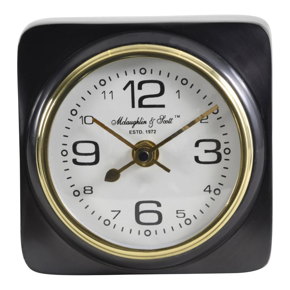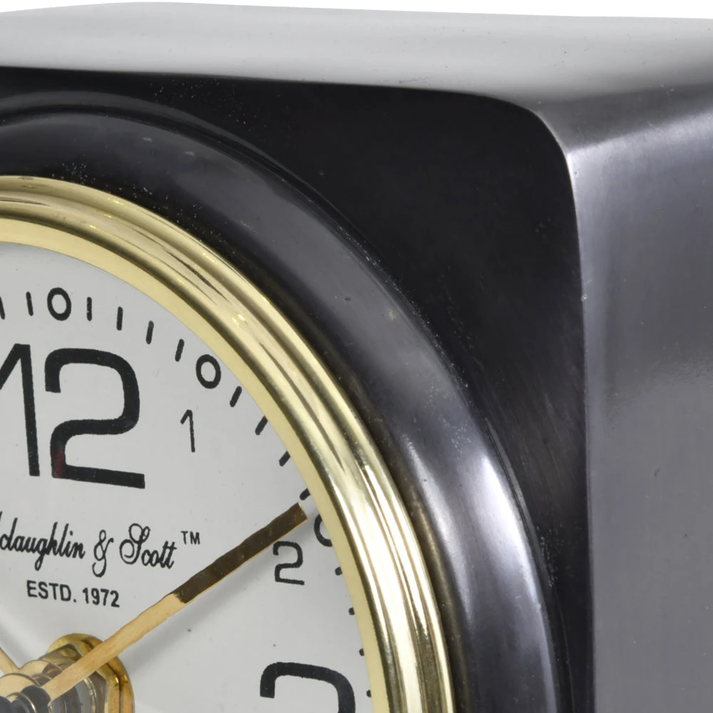 Crafted from solid aluminium with a shiny black nickel finish, the hands of the clock and the circular rim of the clockface are gold-coloured. The numbers are black to match the body. Although this Libra Thompson carriage clock is small and square, it is also striking and is certain to catch the eye of your guests.