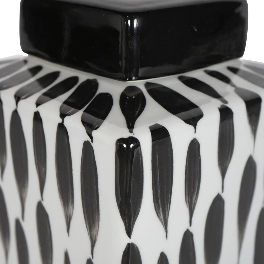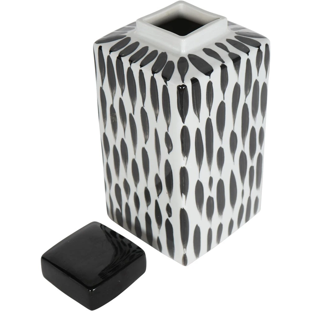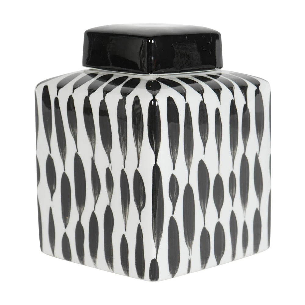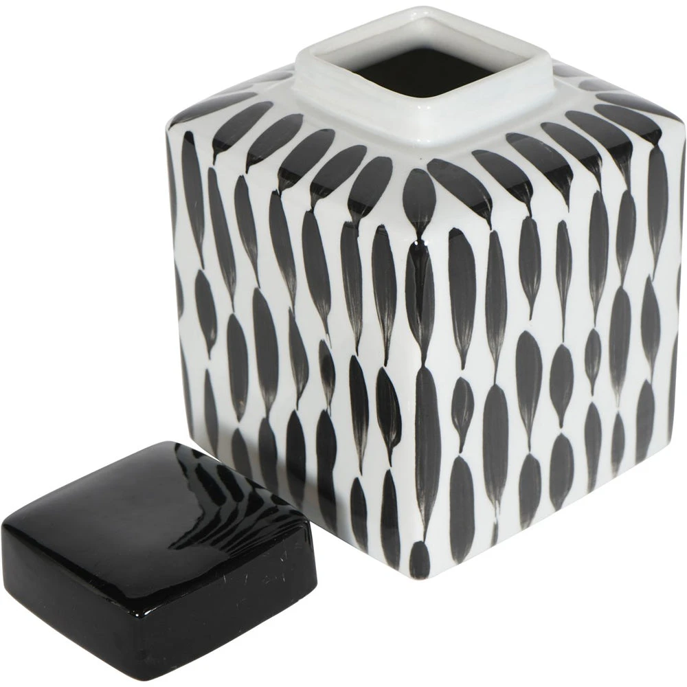 Classic Square Ginger Jar on a gloss white base, with abstract painterly detail in black for a contrasting look. The removable square lid is glazed in black gloss, and can store small items, or simply sit elegantly upon a shelf for decoration.
