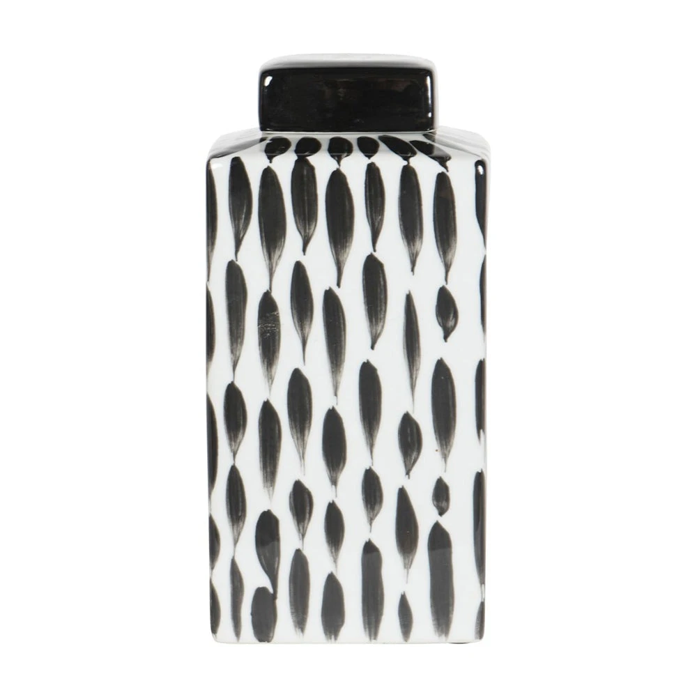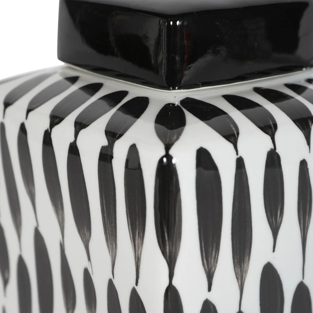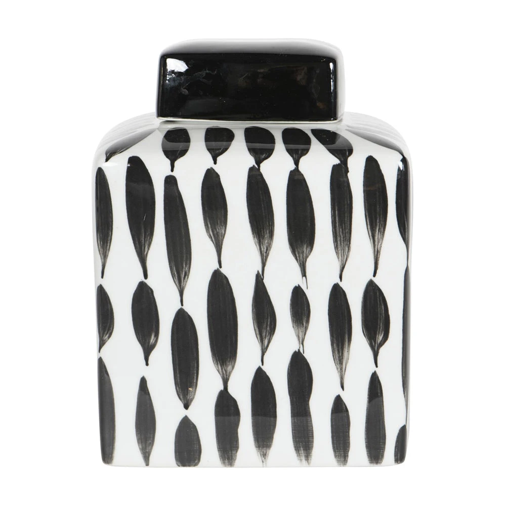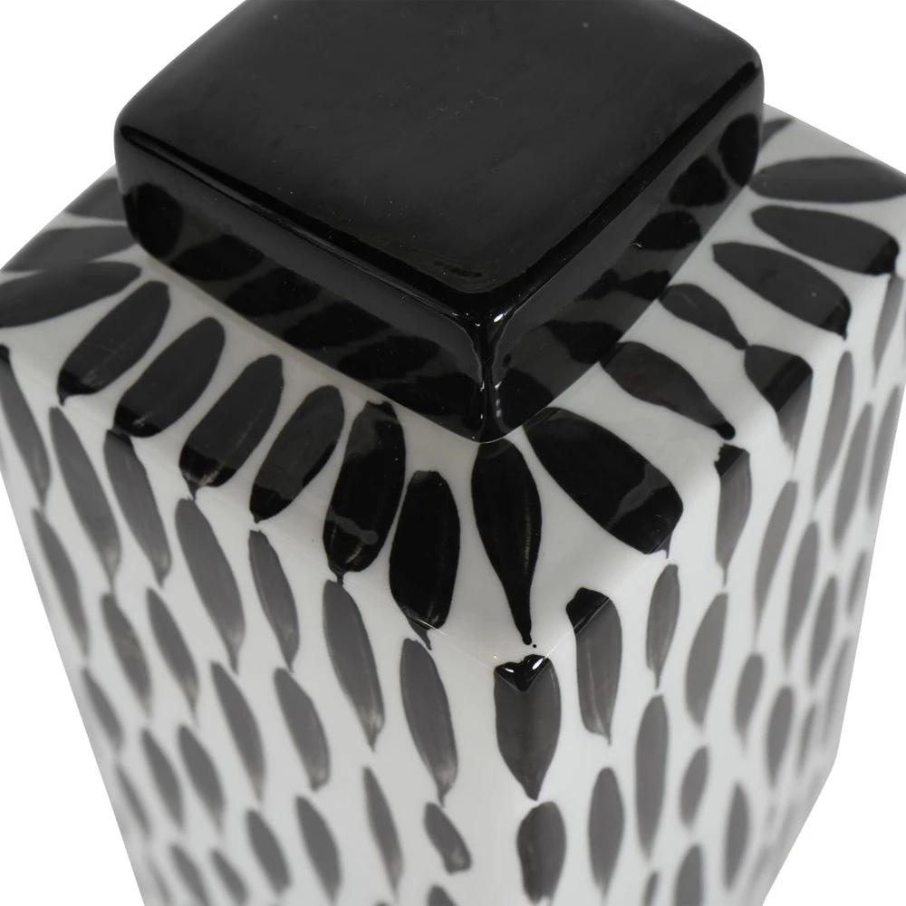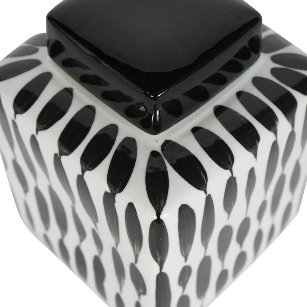 Classic Square Ginger Jar on a gloss white base, with abstract painterly detail in black for a contrasting look. The removable square lid is glazed in black gloss, and can store small items, or simply sit elegantly upon a shelf for decoration.