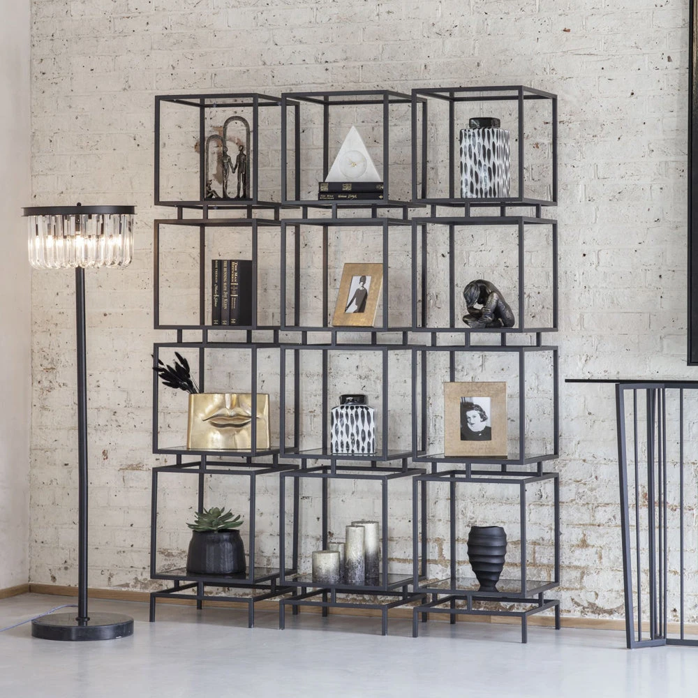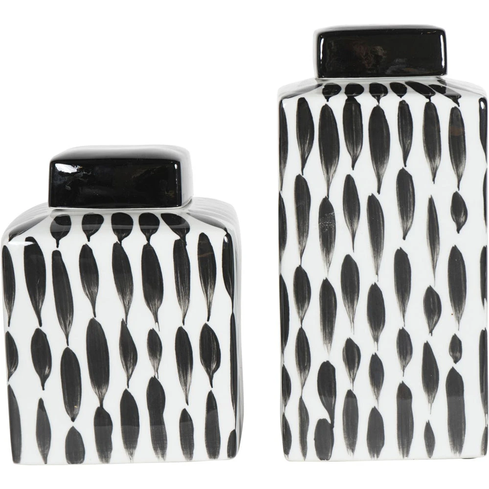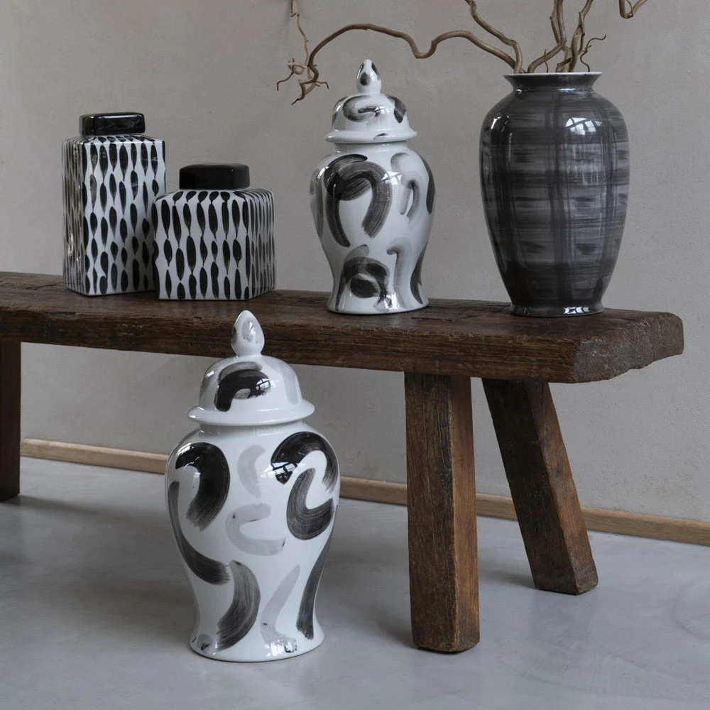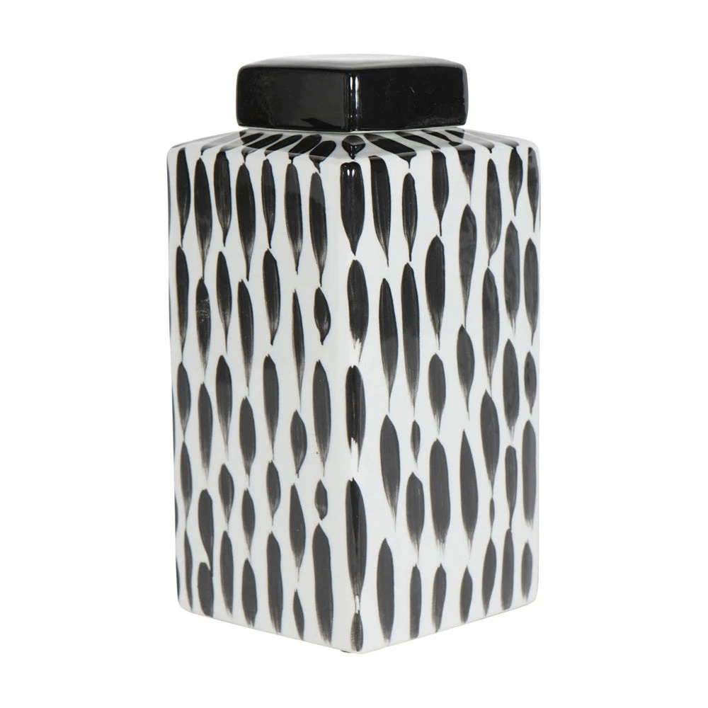 Classic Square Ginger Jar on a gloss white base, with abstract painterly detail in black for a contrasting look. The removable square lid is glazed in black gloss, and can store small items, or simply sit elegantly upon a shelf for decoration.