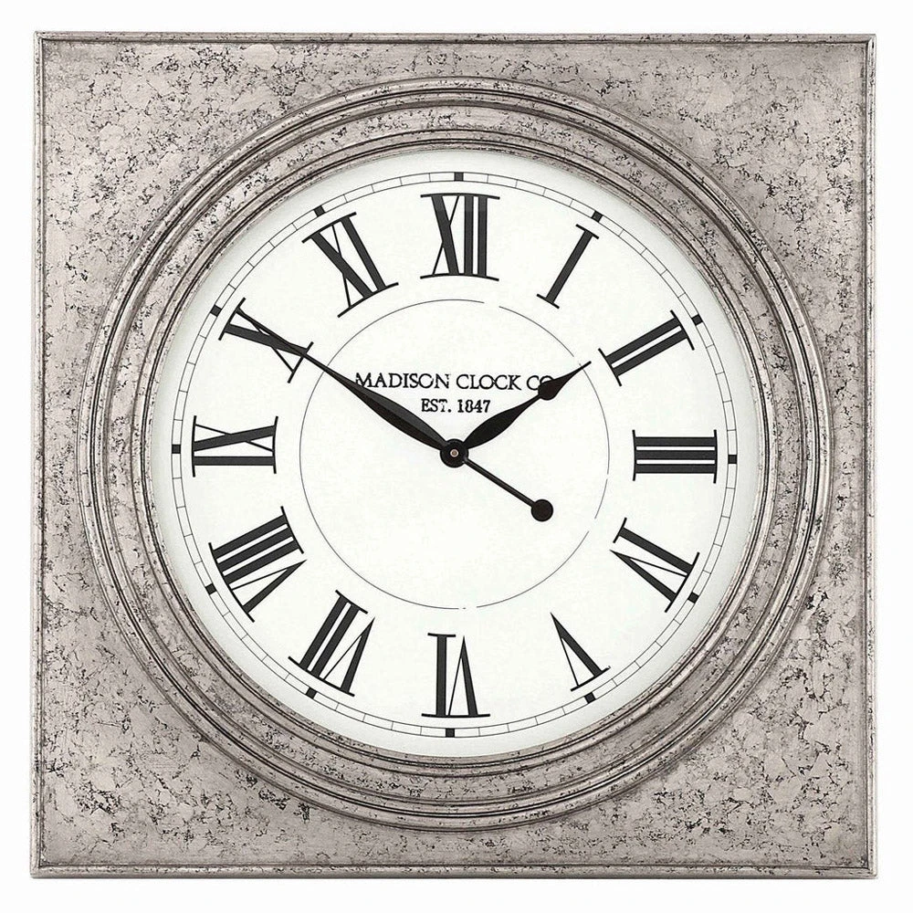 Are you looking for a traditional wall clock with a vintage theme? This large, attractive, wall clock mounted in a square metal case suits many homes and interior designs. It would look perfect in a sitting room, dining room, or hall. It has a clear, cream face with black Roman numerals and black time pointers, with a maker’s name, Madison Clock Co Est.1847