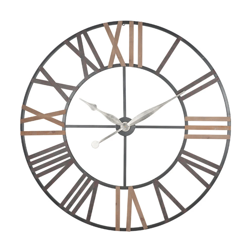 Make a statement on your wall with this classically designed large metal wall clock finished in Antique Grey and wood. The beautiful detail of the delicate double frame with a cut-out roman numeral design creates a traditional feel and a feature piece to a room.