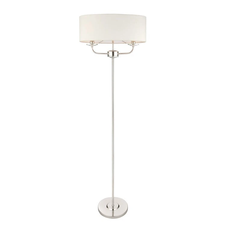 The Nixon Floor Lamp, which has a bright nickel finish and an elegant circular base, includes a neutral white shade with two lights. It measures at W:52 x D:26 x H:157 cm.