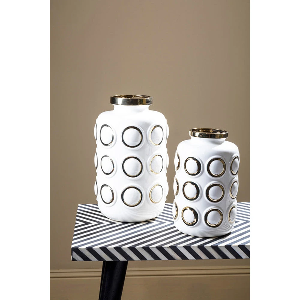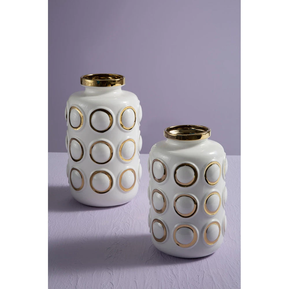 This white vase styled with gold rings and a golden rim would complement any room. The ceramic vase has a gold ring design set into a dimpled surface, giving the vase an interesting appearance, while the gold rim adds a touch of glamour. You can use this vase all around the home.