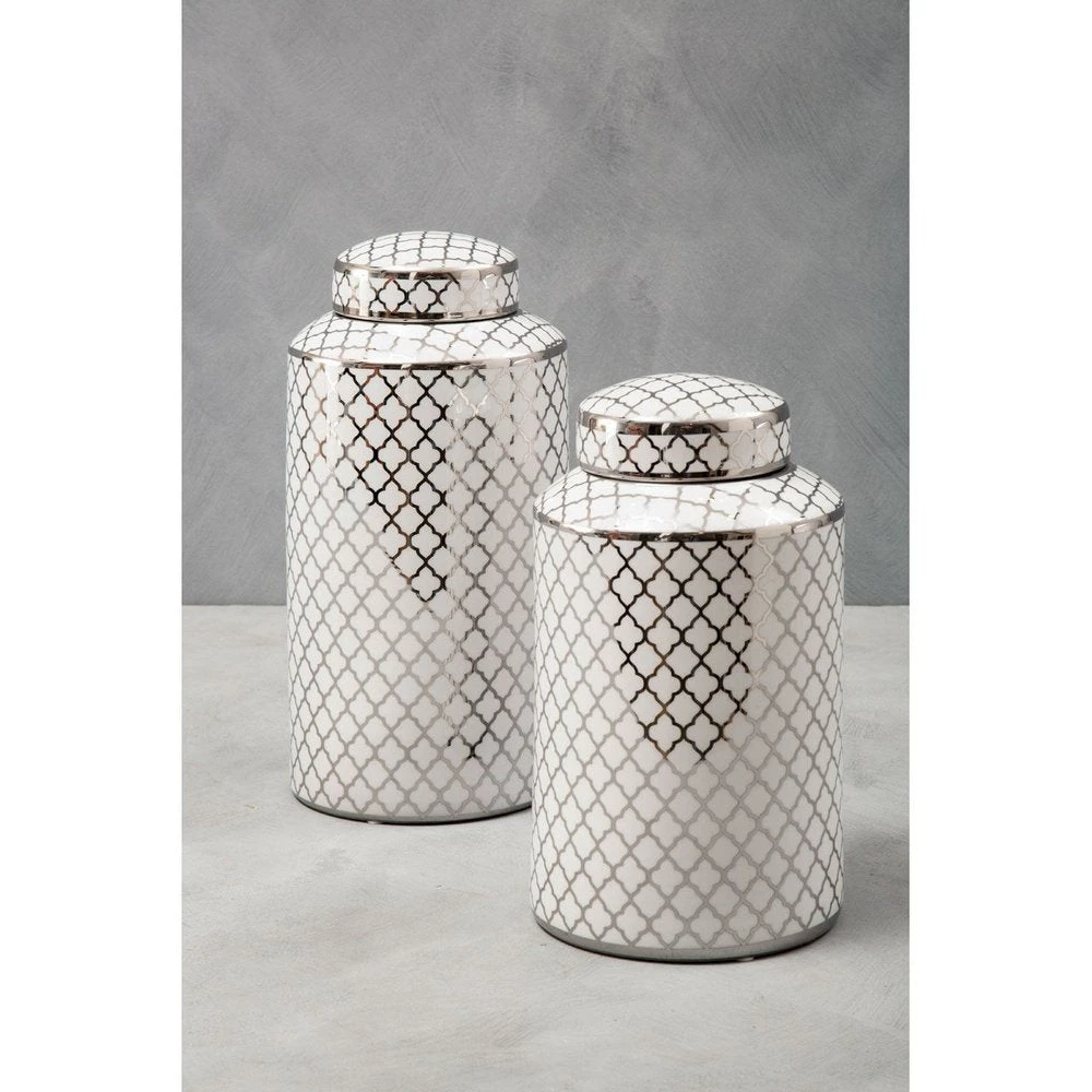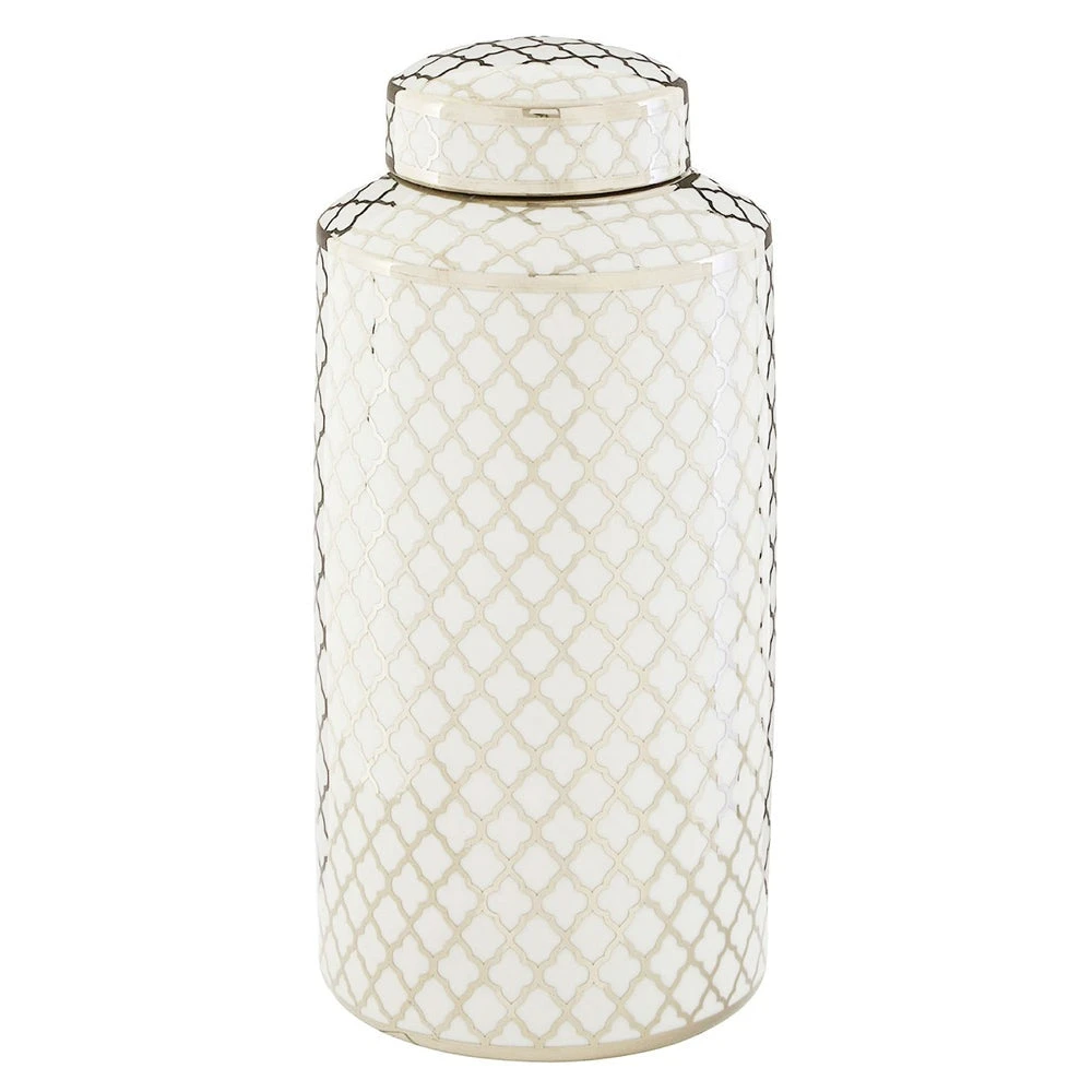 Crafted in ceramic and completed with a glaze for a high-shine finish, this attractive jar features a stunning geometric design, which alludes to the traditional patterns found in Morocco and the East.