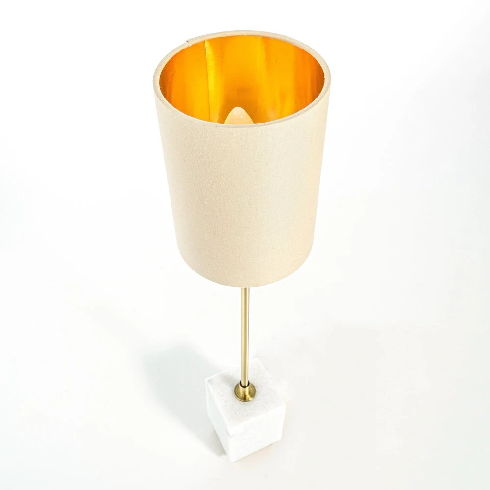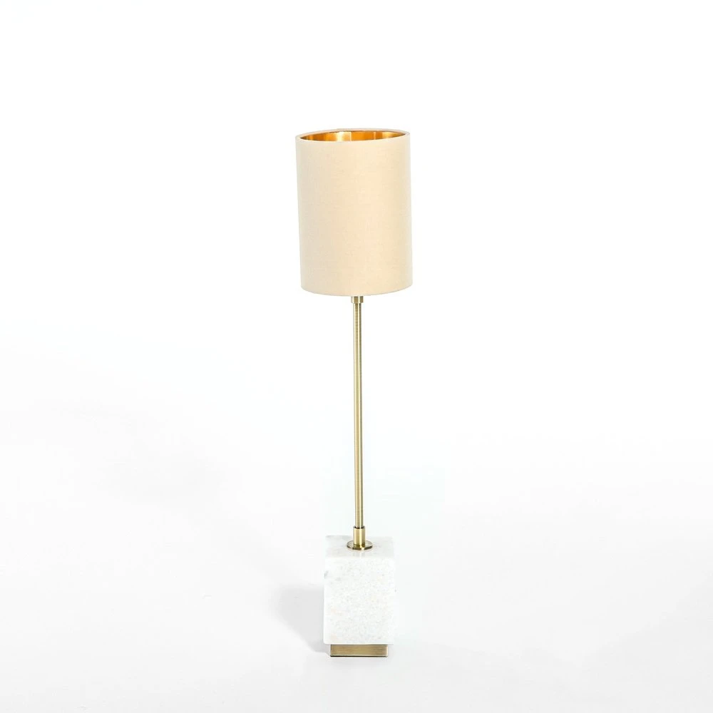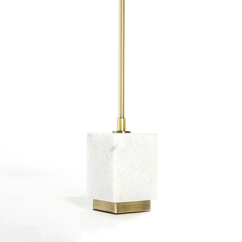 The white marble base provides effortless stability, easily counterbalancing the lightweight shade and light fitting. Its square shape is also eye-catching and the tall slender column adds to its effortless sense of poise.