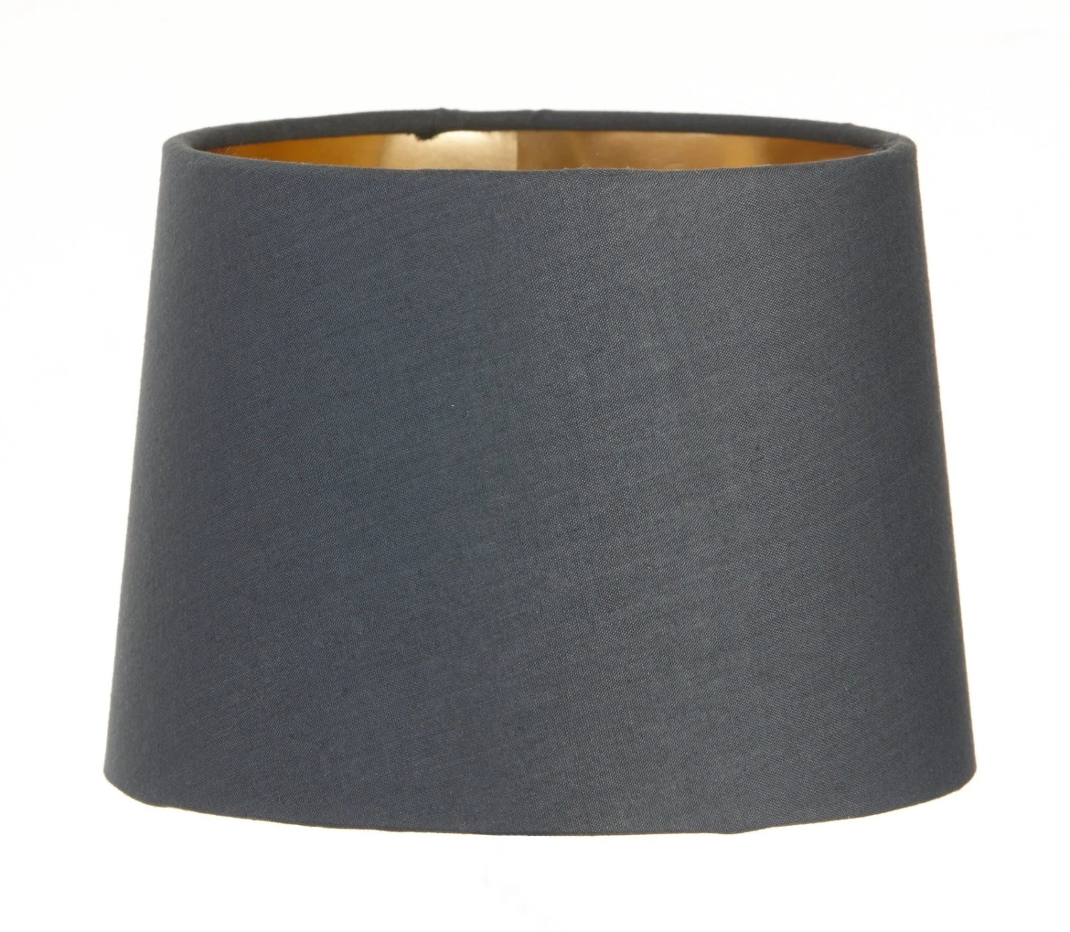 A beautiful charcoal grey fabric shade with a gold lining, measuring 15 cm in diameter and 11 cm in height. The gold lining will bounce the light creating a warm glow in the room, which will be suitably contained by the dark grey colour of the outer shade.