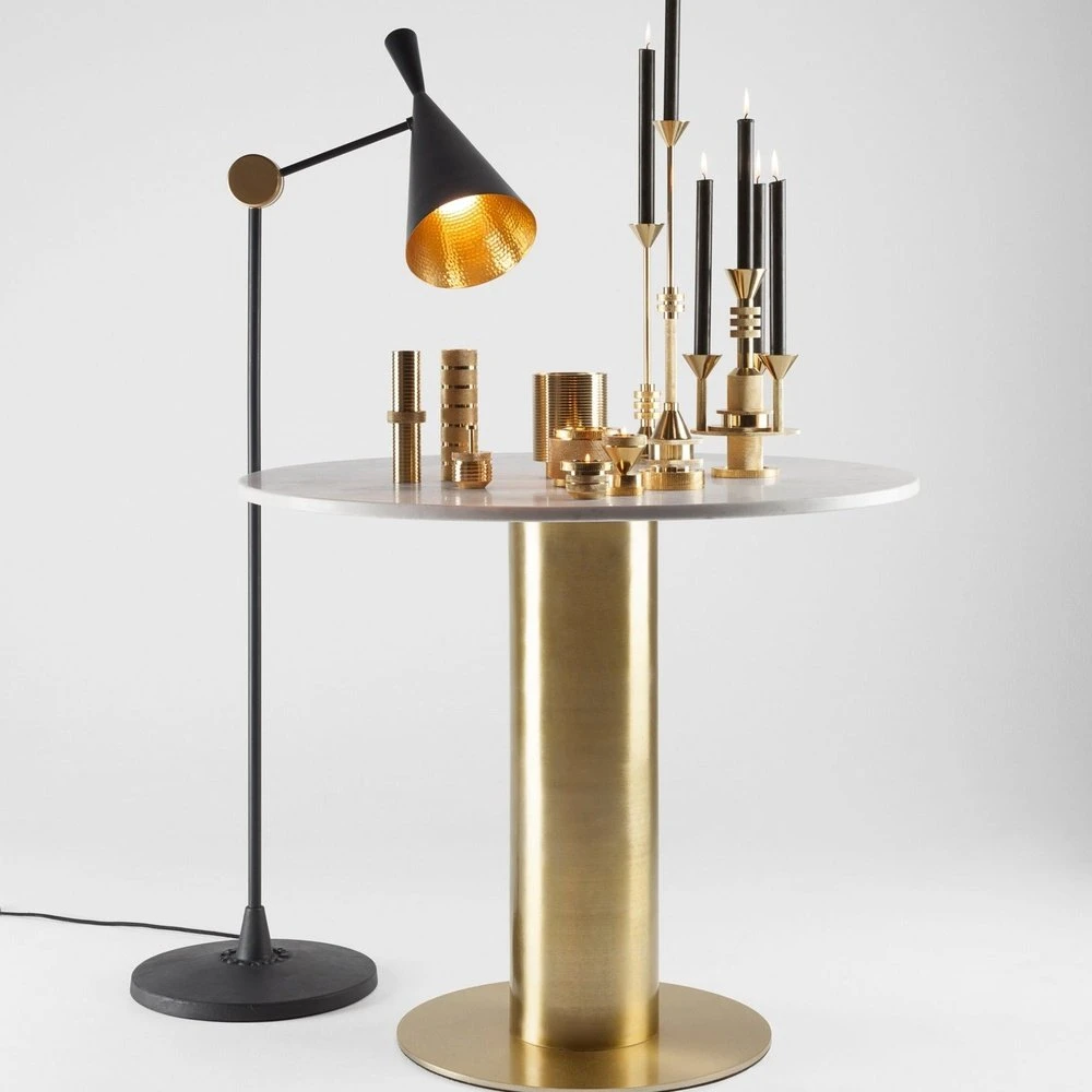 A variation on the famous original Beat Light, this floor standing version on a slender articulated arm can be adjusted to direct the light beam. Solid brass componentry and iron sand cast bases create an iconic footprint for any interior. Beat Floor is also available in brass and as a table light.