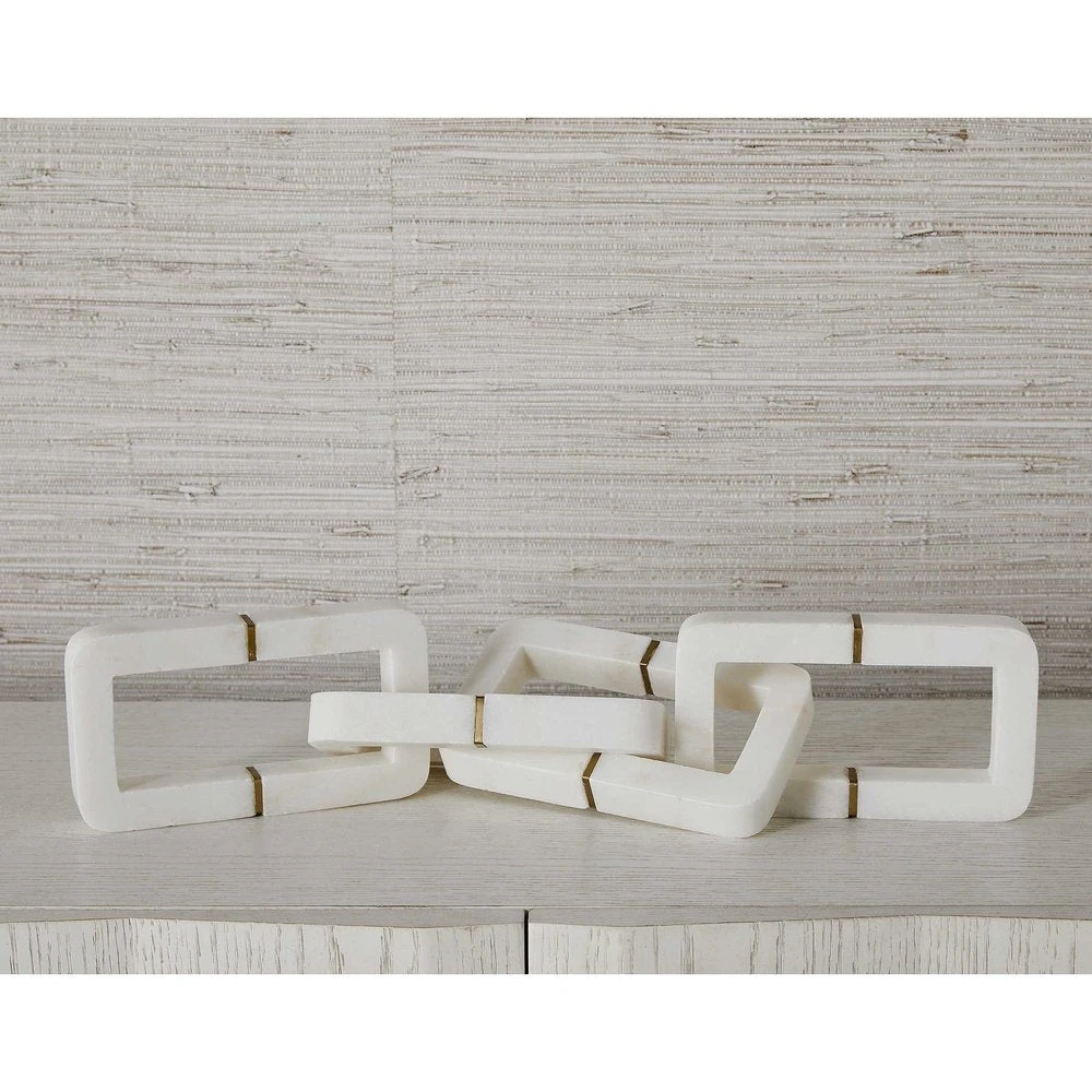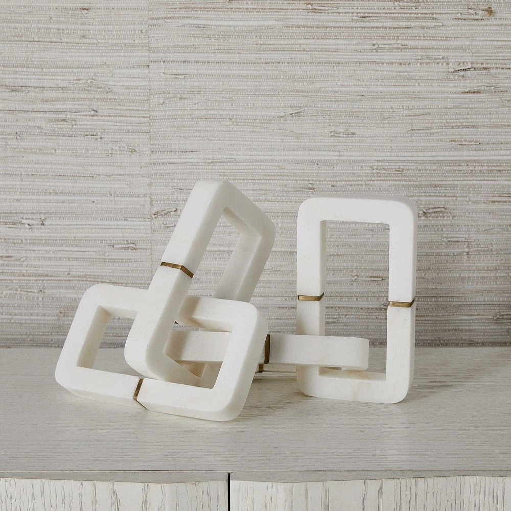 The four links of the Connection Sculpture are made of white marble, and contain thin metal bands in a rich brass finish. Enjoy finding your favorite configuration, whether it be lying flat on a coffee table, or building up to add height on a book shelf.