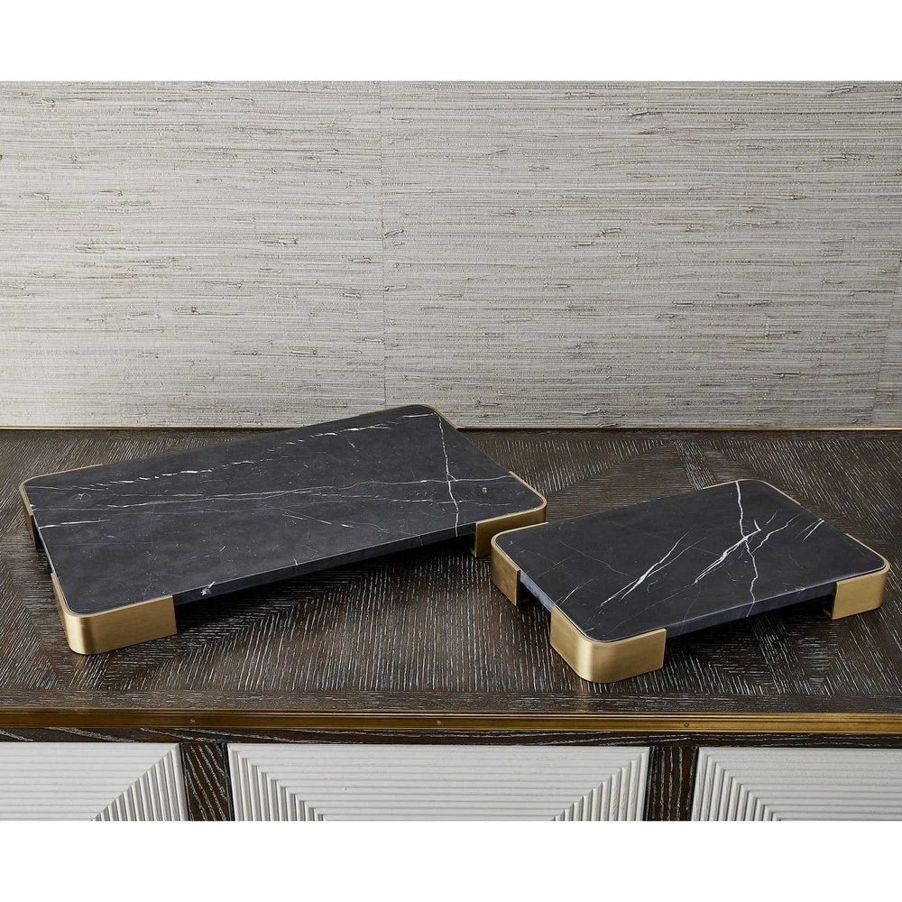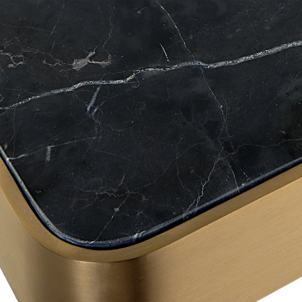Black marble with white veining is suspended between four metal corners finished in a rich brass. Rounded edges feel sleek and elegant, giving an art moderne feel. Creating displays of your favorite objects, or organizing spices and oils in a centralized location, are just a few of its many uses. Due to the porous characteristics of this natural stone, acidic items and constant moisture should be avoided.