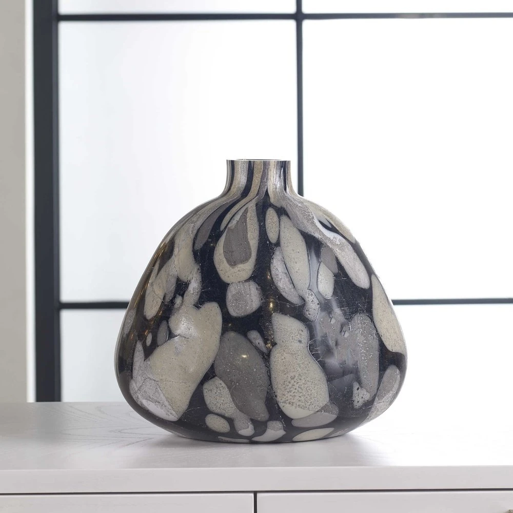 Hand blown art glass vase has an asymmetrical oblong shape that looks and feels similar to rustic 18th century folk pottery. Black glass is embedded with neutral medallions in shades of off white, beige, and gray. As glass is blown medallions all change shape and size making every piece unique.