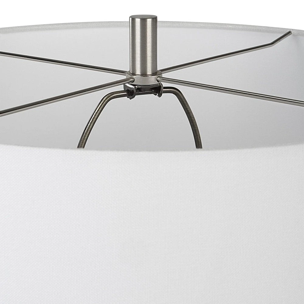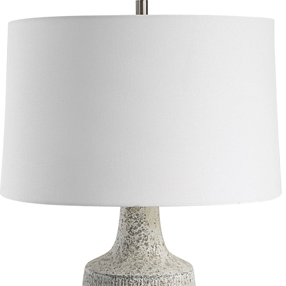 Drawing inspiration from antique clay pottery, this table lamp is handcrafted from ceramic in a mottled grey and off-white matt glaze, with subtle carved details. Steel accents are finished in brushed nickel. The hardback drum share is covered in a casual white fabric. Due to the nature of fired glazes on ceramic lamps, finishes will vary slightly.