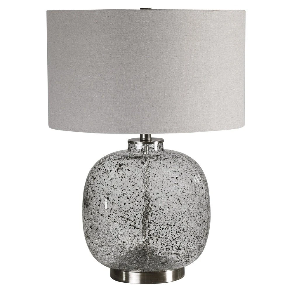 Modern style table lamp features a translucent art glass base with abstract black flecks throughout, accented with brushed nickel details. The round hardback drum shade is a light grey linen fabric with natural slubbing.